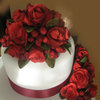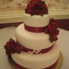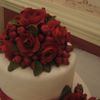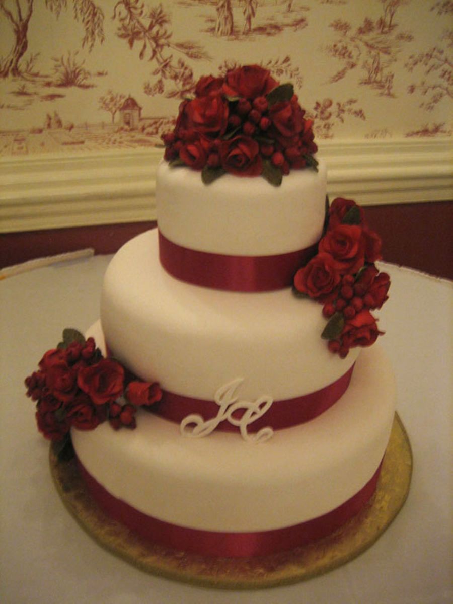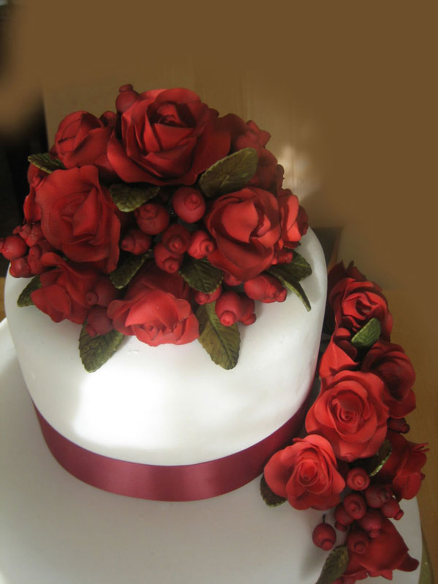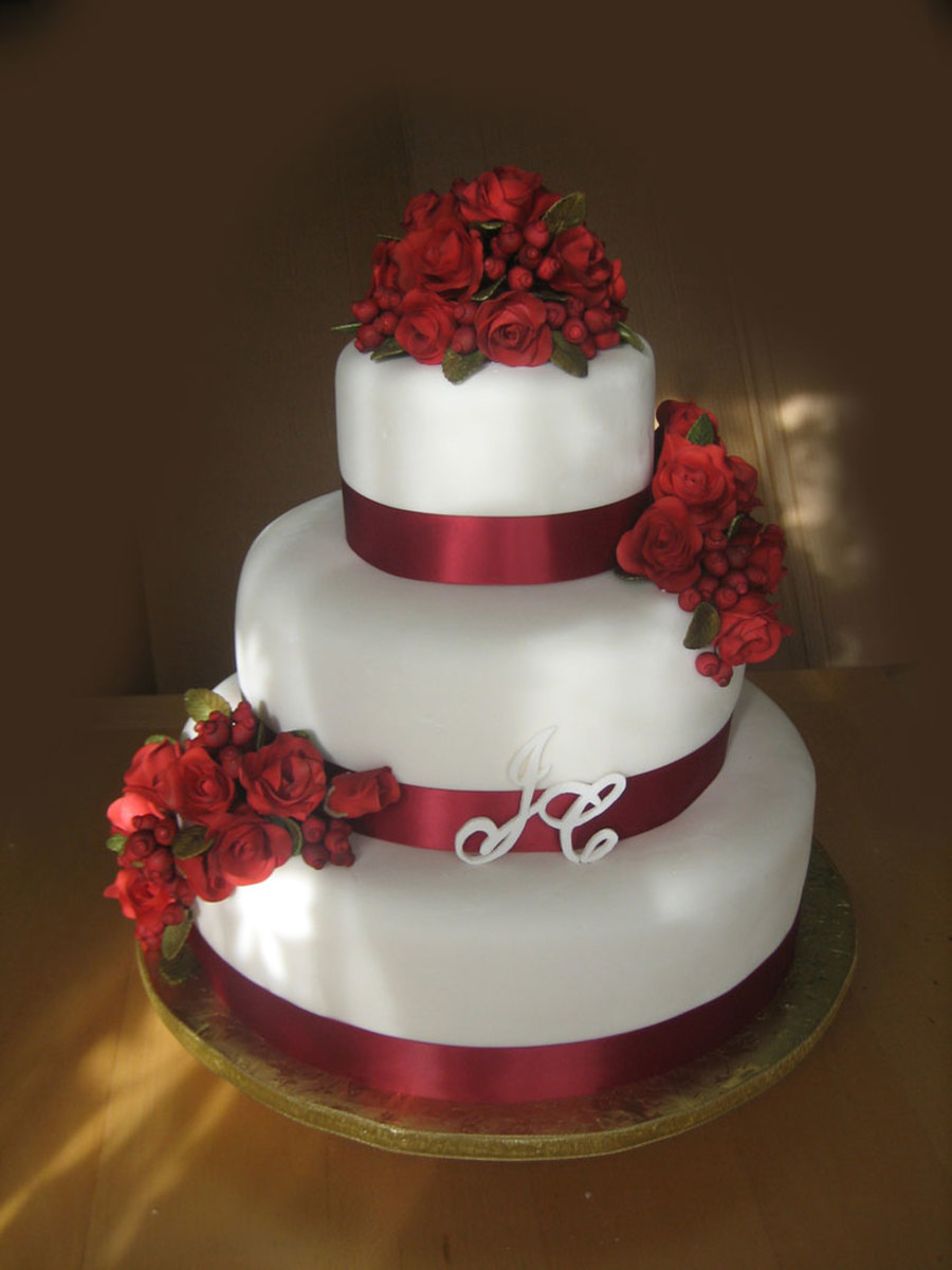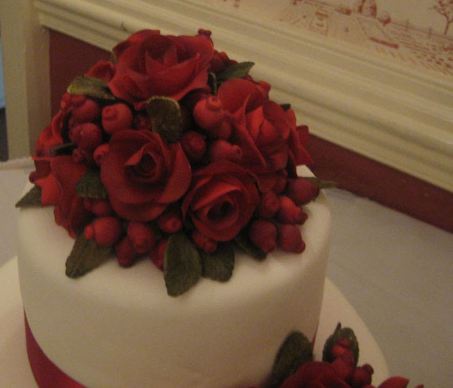 14",10" and 6". Fondant roses, berries and leaves. The bride wanted red roses, the venue was going to be decorated red and gold, like a christmas preview theme. The ribbon had to be the color of the bridesmaid dresses.