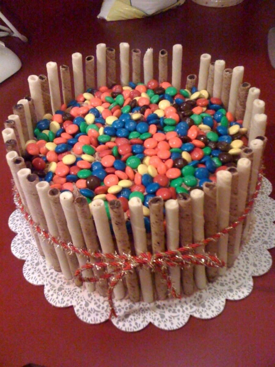Just wanted to try this out, so I made it and sent it to work with my husband. It was a chocolate cake, chocolate mousse filling, chocolate buttercream, and M&M's.