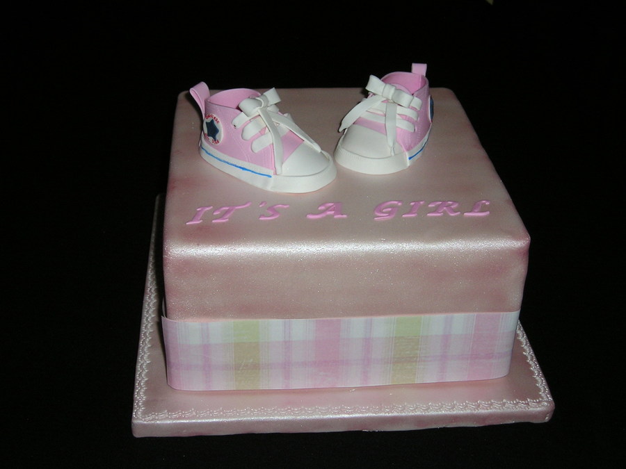 Shoes are made with gumpaste using pattern in template gallery. 8"x8" 2-layer square cake airbrushed with pink sheen color. A fabric ribbon is placed around the base.