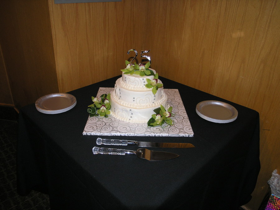 Cake I made for my inlaws 25th anniversary. Layers were WASC, Lemon poppy seed and chocolate. Idea from CC.. TFL :)