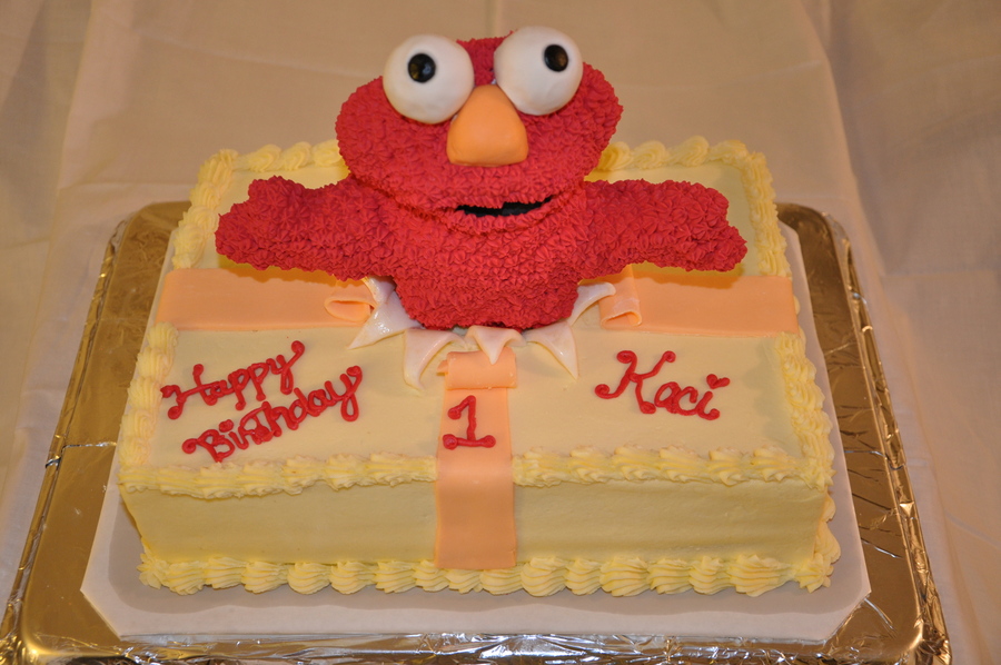 I had no idea what kind of cake to do for my daughter's first birthday. She has shown a lot of interest in an Elmo doll so I decided to try it. I did get my idea from others on this website (many thanks!). This is a french vanilla cake with strawberry filling and buttercream frosting. The ribbon/burst accents are fondant. Elmo is made from rice cereal treats. Eyes and nose are covered in fondant. Mouth is painted with black royal icing. Head/torso is piped with royal icing.