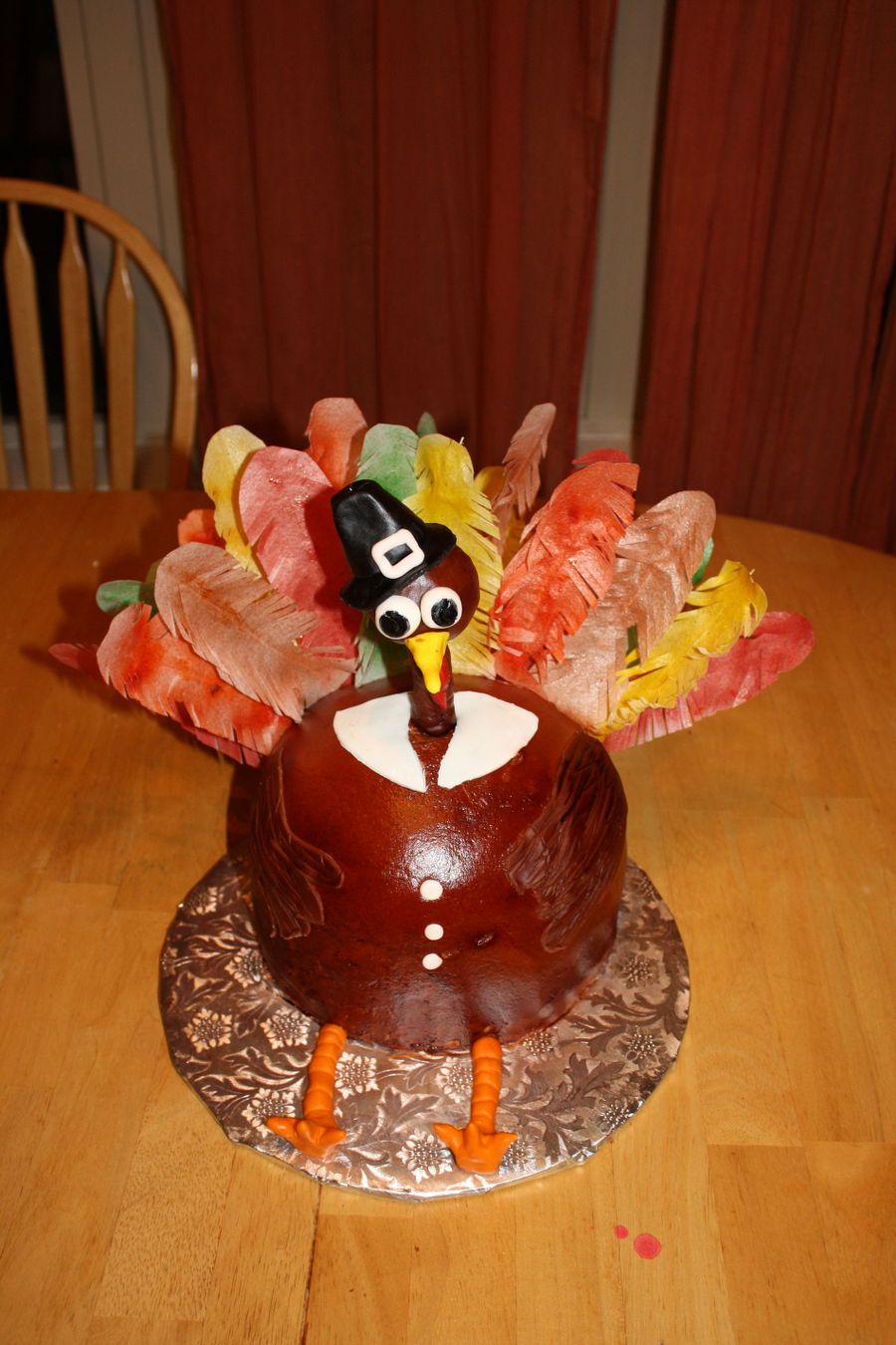 My 11 year old and 9 year old did most of the work on this Turkey. We wanted to make something fun for the family. They had so much fun cutting and making the feathers. I think their favorite was spraying the feathers with color. Then they decided to make him look like a pilgram. I think he's very cute. yellow cake with peanutbutter icing! thanks for looking!