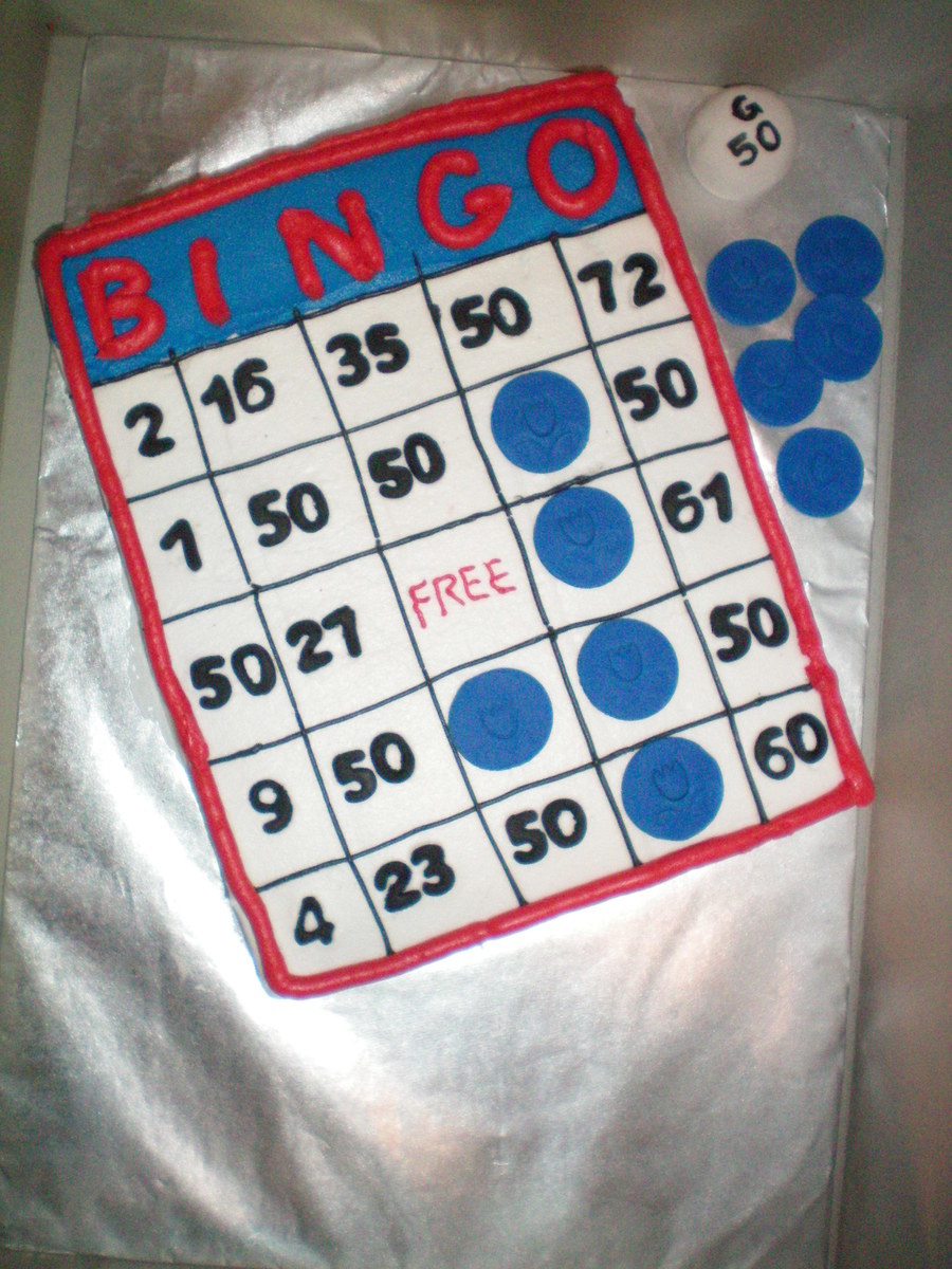 My boyfriends mom loves BINGO so we made her a bingo card for her birthday. She was turning 50 so we put 50's all over the cake. All buttercream with fondant chips and numbers.