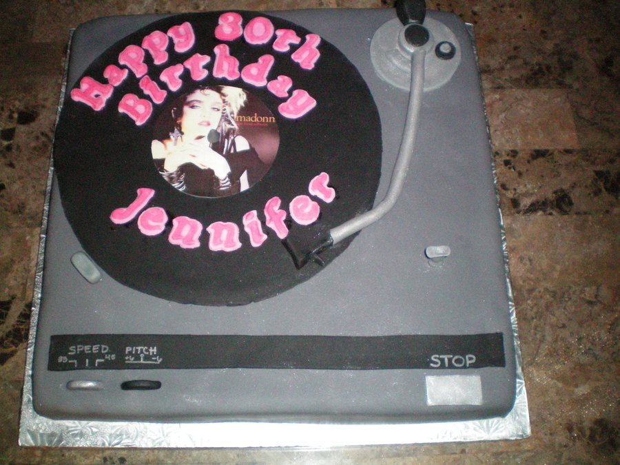 I loved making this cake! I got most of my ideas from CC and a lot of tips from users here. All edible except the Madonna Pic. Fondant covered with fondant/gumpaste accents. Request was for a record cake with and 80's theme, why not go all out and make the whole turntable?!