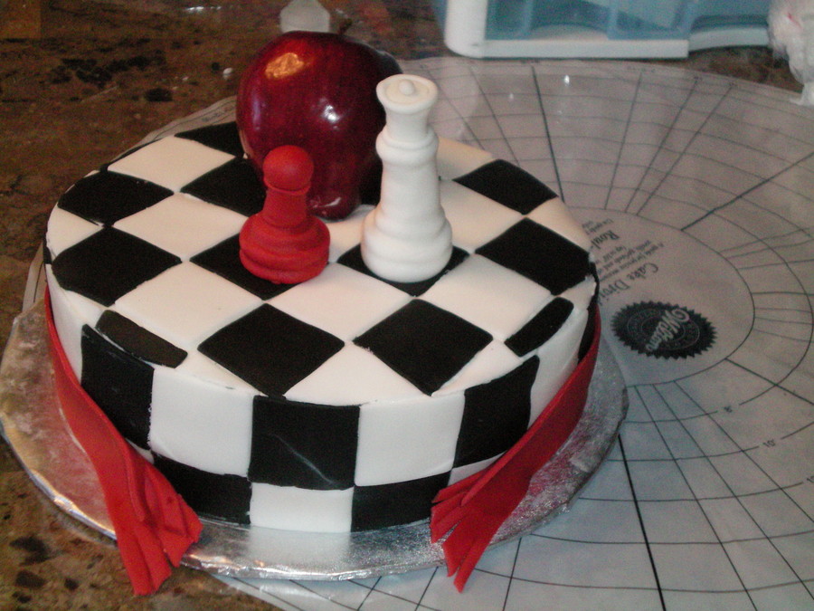 This was inspired by several pictures online. Seems a popular design. I had no idea what twilight was when someone requested a twilight cake. This is my FIRST ever cake for sale. Sold it for $15 I still have no idea how to price cakes. Red Velvet cake, cream cheese icing with fondant accents and checkerboard. Real apple.