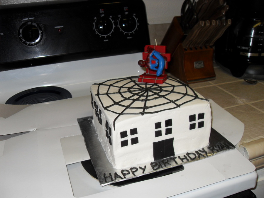 Spiderman cake. I really wanted to do red fondant lettering on the top but I was having so much trouble getting the cutouts out of the cutters! I gave up after 30 minutes and I didnt have time to make red icing. The request was a white cake with spiderwebs, the cream cheese icing was so yummy! they still loved the cake!