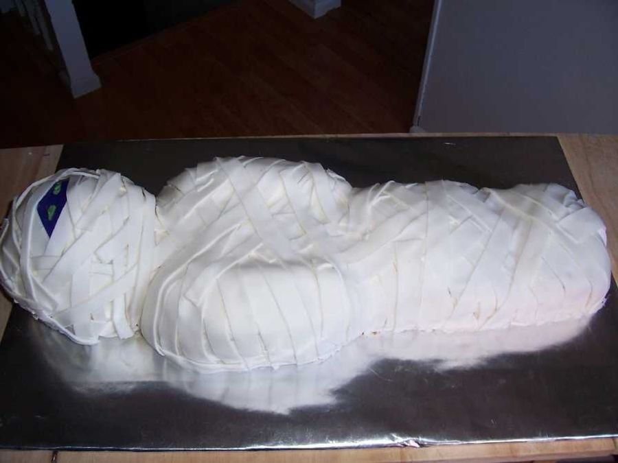 Used 1/2 ball pan (head), 8" square(body), 6" square (legs), 8" round (part under ball for head, part for arms, rest for feet). Raspberry filling and green icing between layers. Crumb coated with white buttercream and covered with strips of MMF. Length is almost 2 ft.