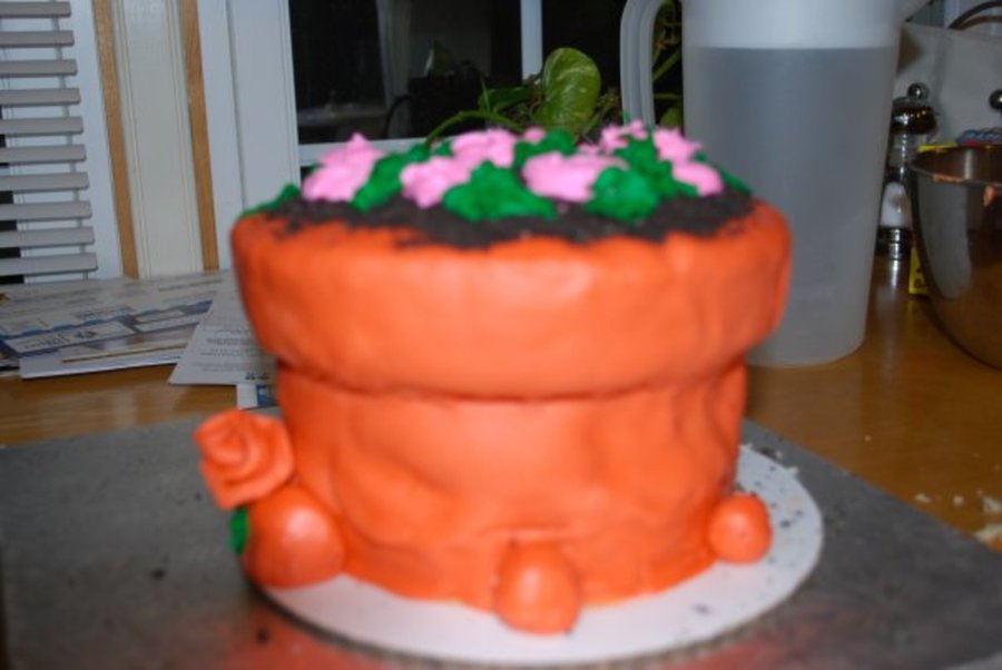 My 1st attempt at making a flower pot cake. My 1st time using fondarific, tastes great, but creates air pockets when I placing on the cake. Thanks for looking..