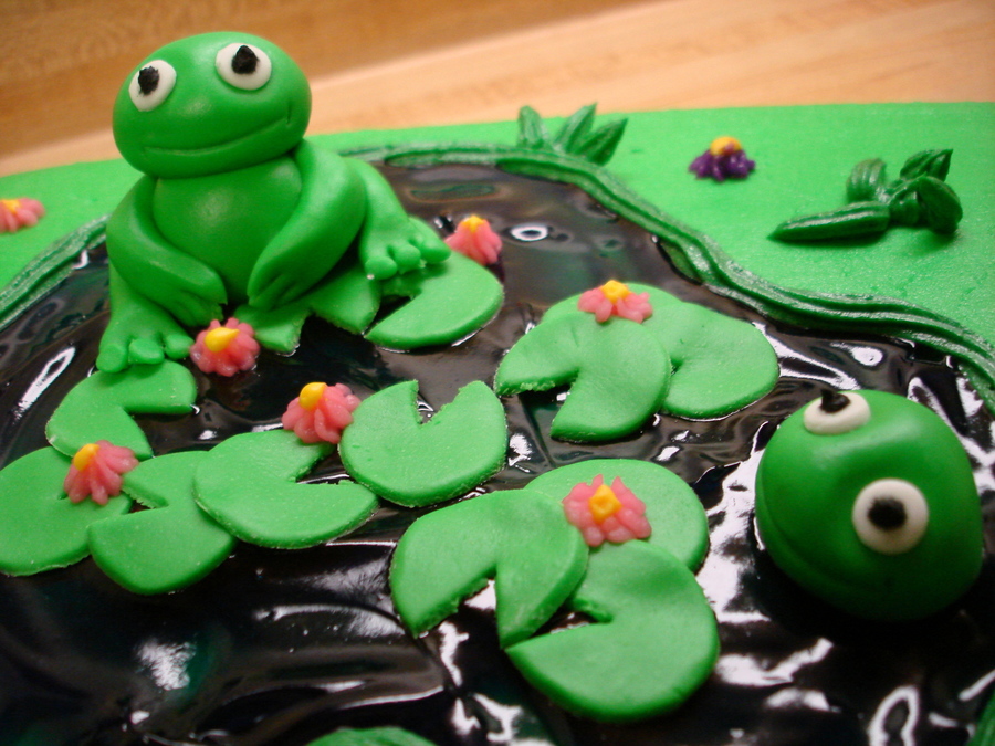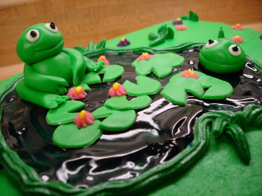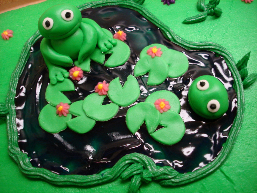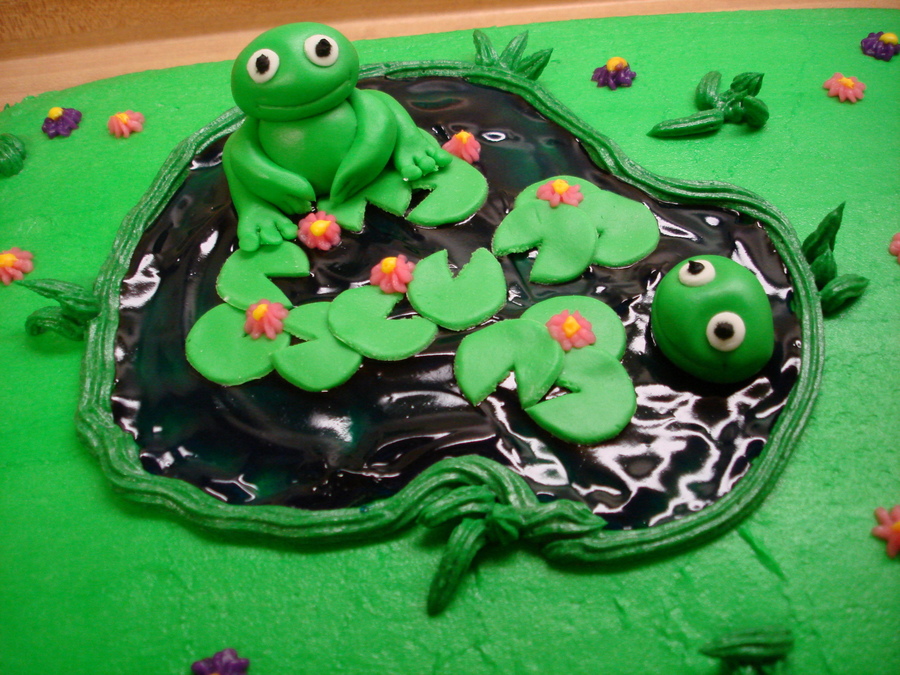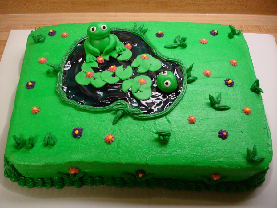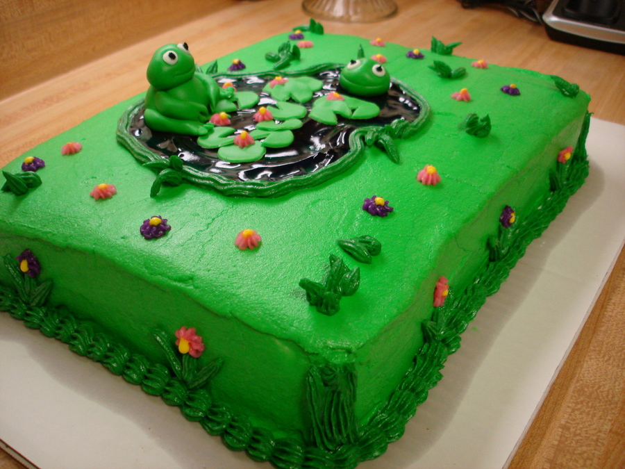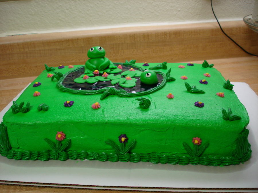 This cake was for my girls (just a few of my guinea pigs. lol). This was one idea off my "cake idea" to do list. It's a quarter sheet butter cake with chocolate filling. It's covered and decorated in homemade lemon buttercream (well most of it, the flowers were tube icing). The pond is piping gel, the frogs and lily pads are homemade lemon mmf. I really enjoyed making this cake. I think I'm getting faster, cuz this one only took me two days (day one: baking, filling, crumbcoating. day two: icing, decorating) I was really surprised I got it done so quickly, and with no stress at all!