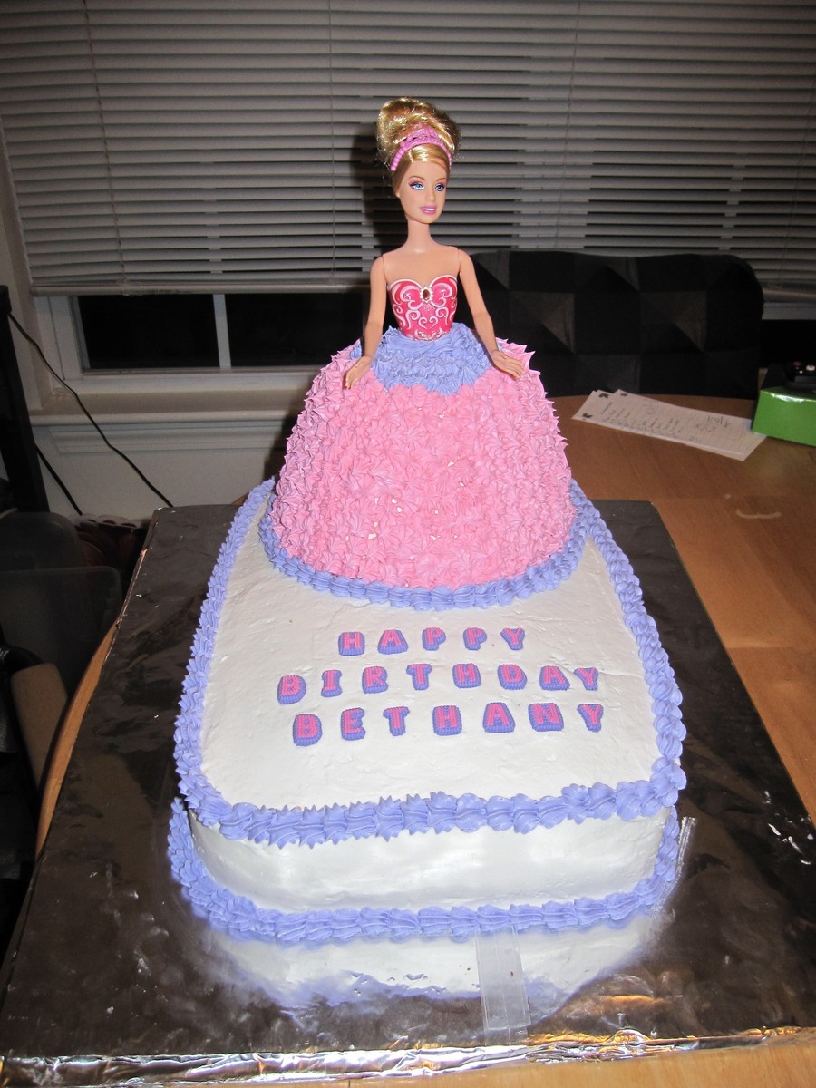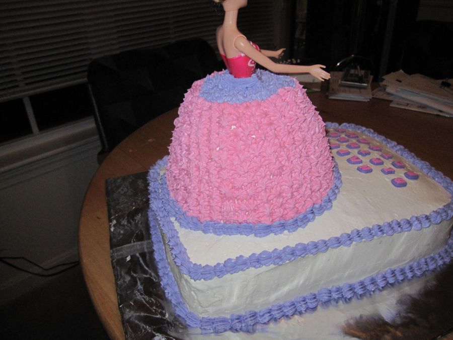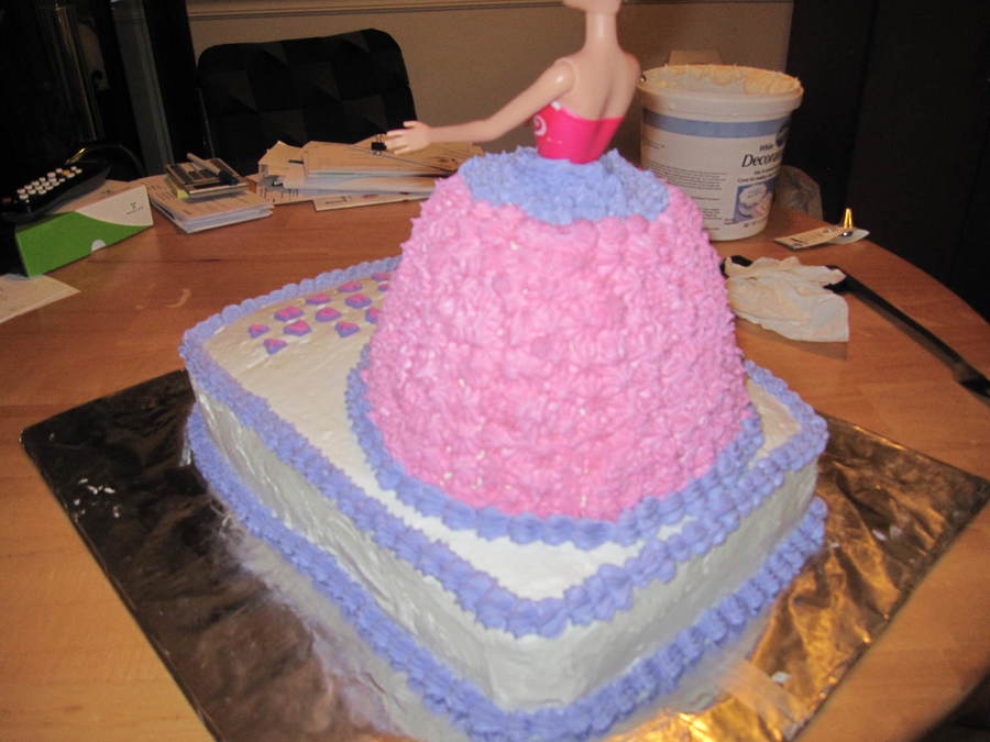 This is my first cake & my first barbie cake. Made for my daughter's 5th birthday. Made with 15x10 sheet yellow cake base with pink buttercream filling. Dress made with Pampered Chef large batter bowl - Yellow cake. All Buttercream icing.