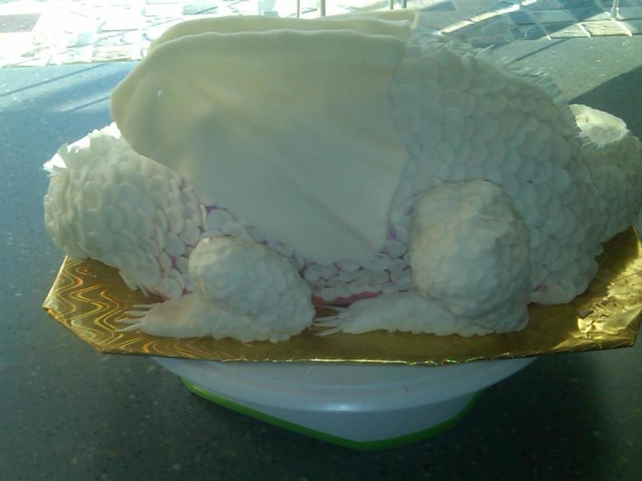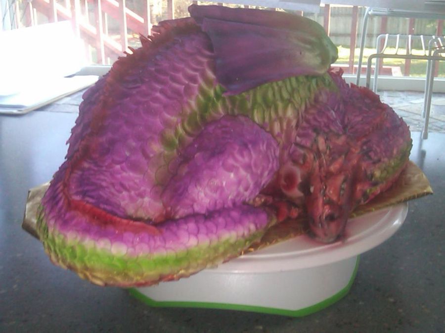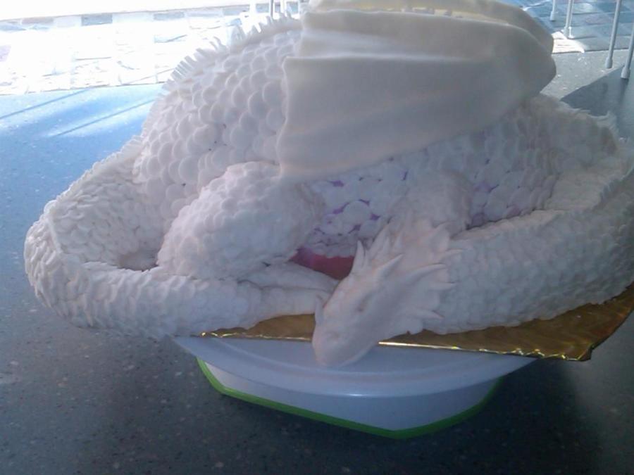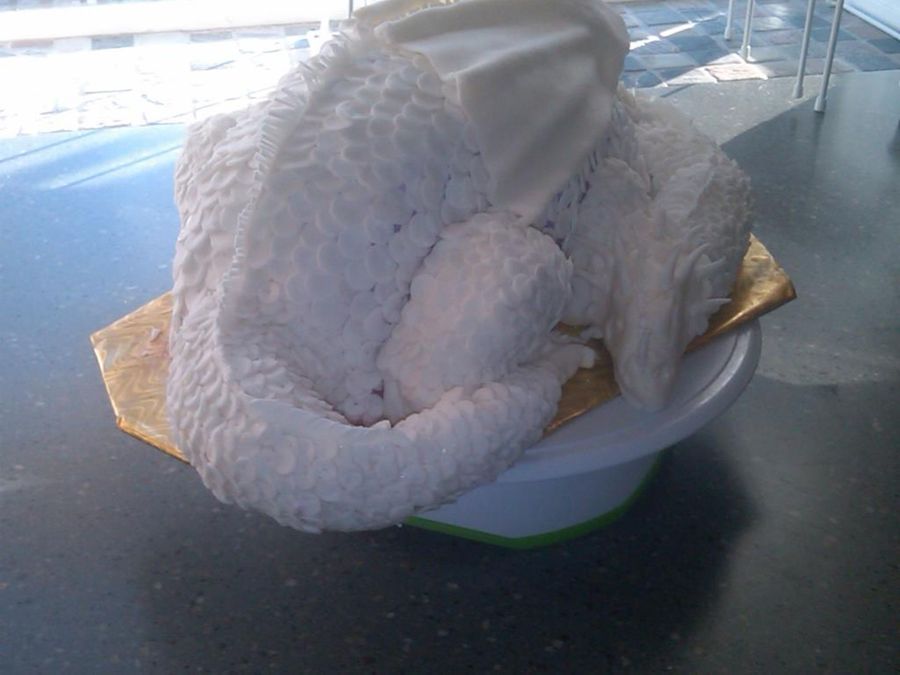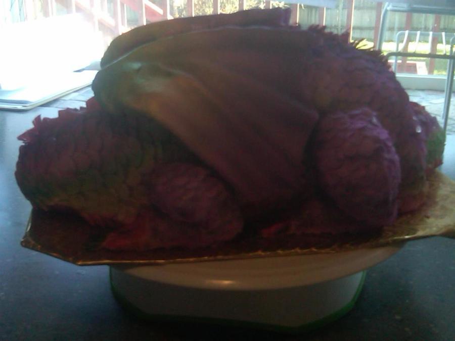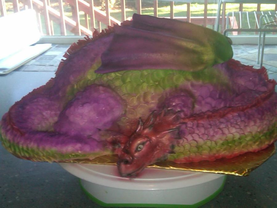 My son's gf asked for a Dragon cake for her bday today, so here's what I came up with... I uploaded two pics of the cake, since I usethis sight to get new ideas and learn new things, I figured I'd show the cake with and without airbrushing... the cake is a basic golden yellow with bc icing it it covered with mmf, the scales are mmf, the neck and tail are rice crispy treats covered in mmf and the wings are white chocolate modelling clay ... the whole piece is airbrushed in food coloring....