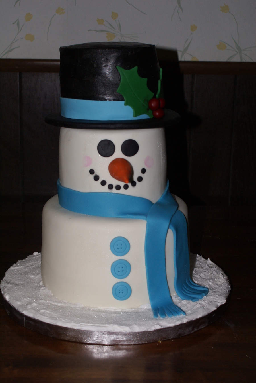 My first 3 tiered cake! Challenging but it turned out pretty good I think. I got the inspiration from Marniela and her snowman cake.Thanks for thr help Marniela! Bottom tier is 9" vanilla cake(4 layers) with strawberry filling, second tier 6" ( 3 layers) choc cake with choc b/c, top tier 5" (3 layers) orange cake with cream filling. All fondant, hat is b/c. Thanks for looking!