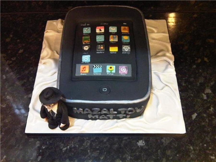 choc cake with choc cream filling covered in sugarpaste. buttons all made from sugarpaste. Little model of bar mitzva boy at the front made from gum paste.