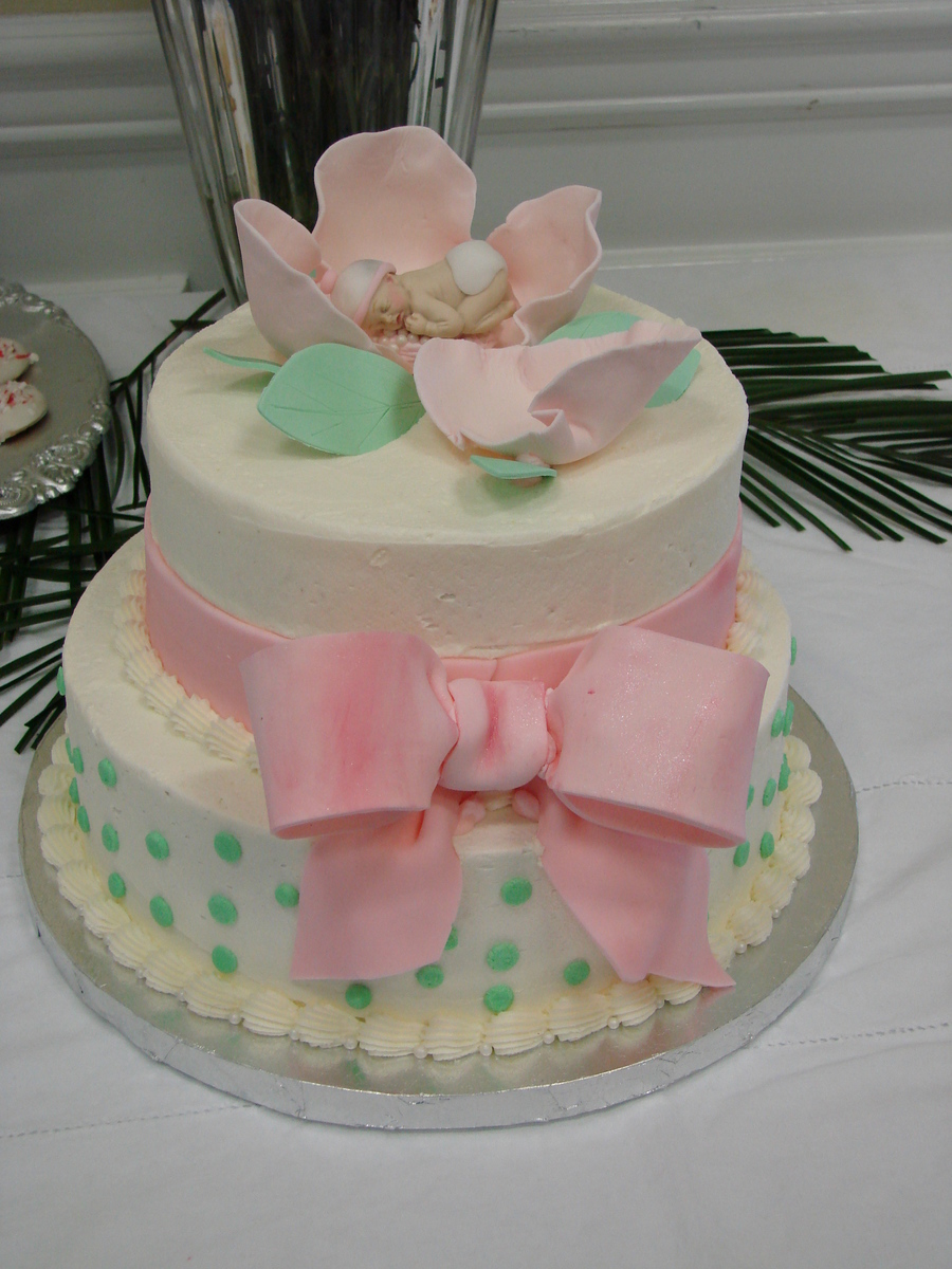Almond Cake and Chocolate Cake ........ Buttercream Icing .... Gumpaste Flower, Baby and Bow and Fondant Ribbon.