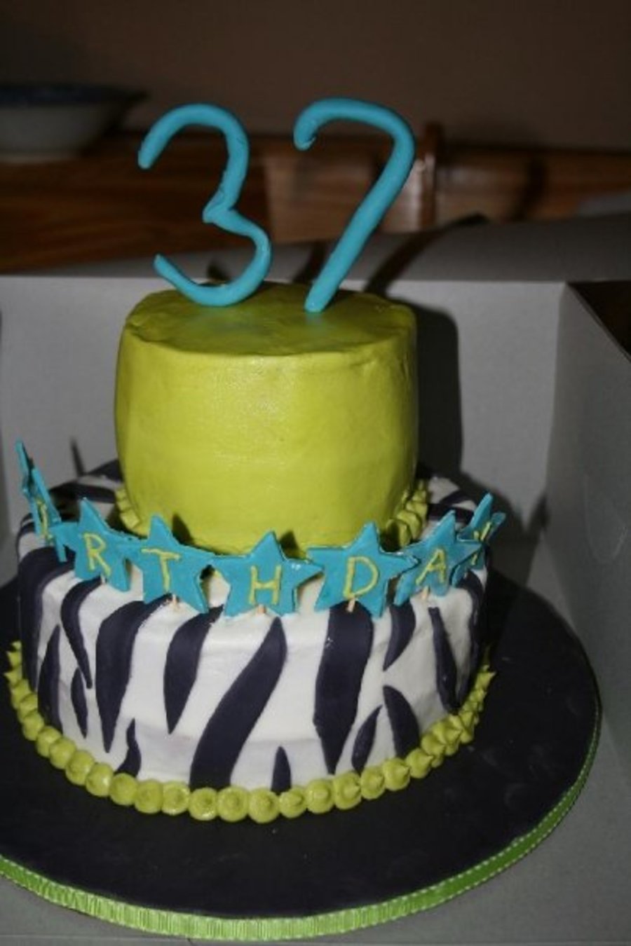 Lime and zebra birthday cake. Buttercream with fondant stripes. Stars and numbers are gumpaste. This is the first time I have put ribbon around a cake board, and I must say, I really like it!