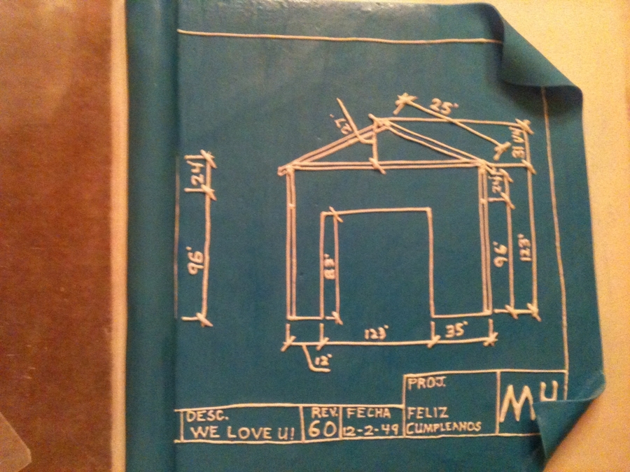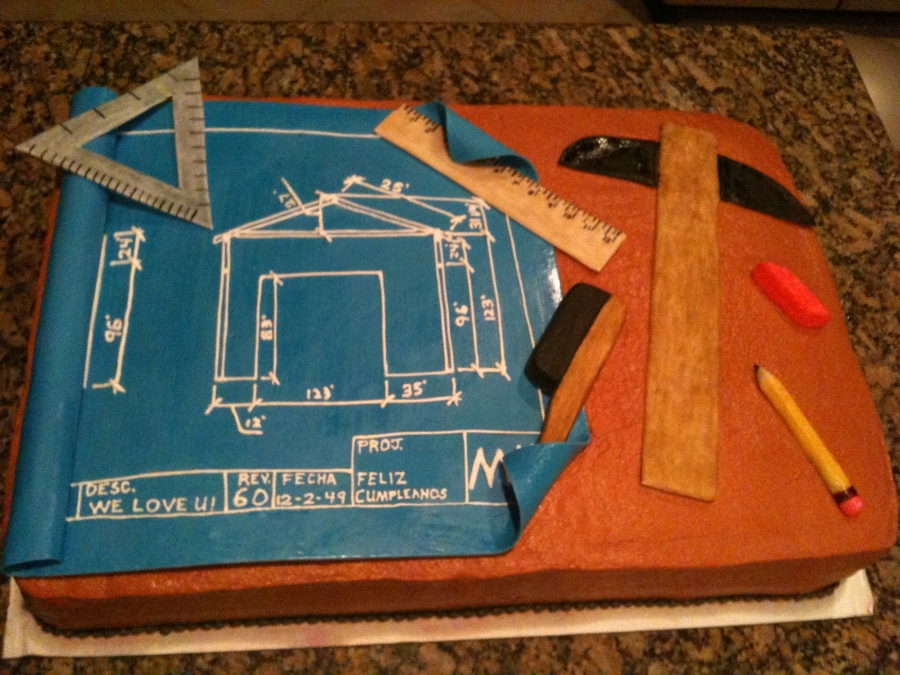 My dad is a drafter but is always fixing things around the house too. For his 60th birthday, I made this cake of a blueprint with some of the tools he uses. I used one of the blueprints he had made for a garage he was fixing up. I freehand drew the blueprint with royal icing on mmf blueprint. The tools are all mmf and hand painted. BC icing on cake.
