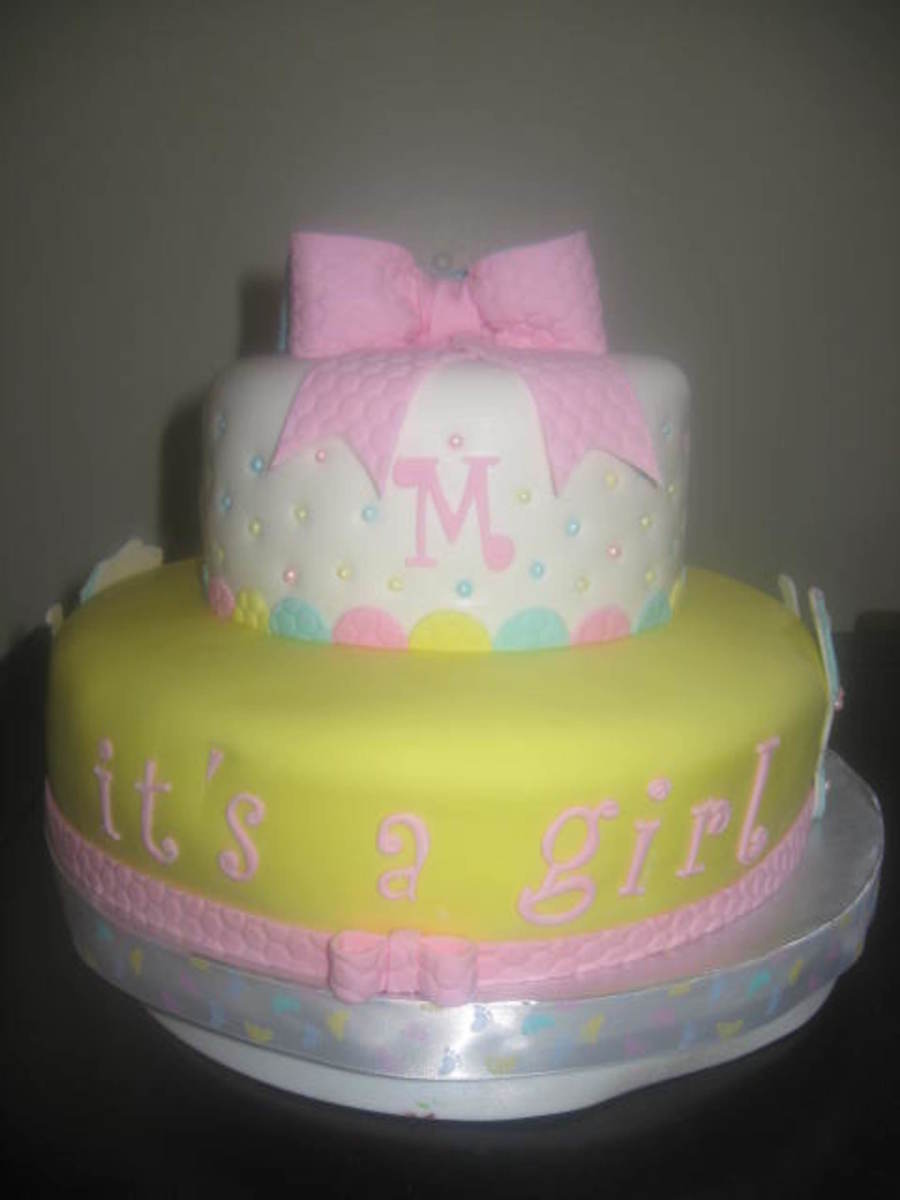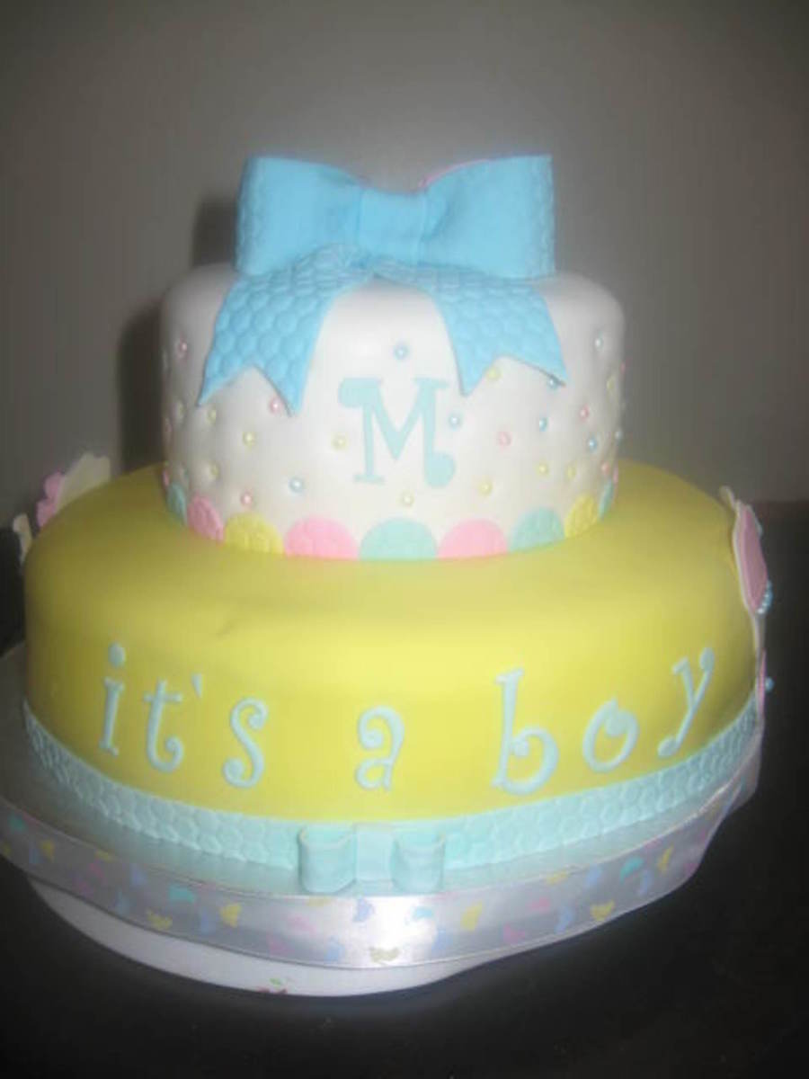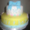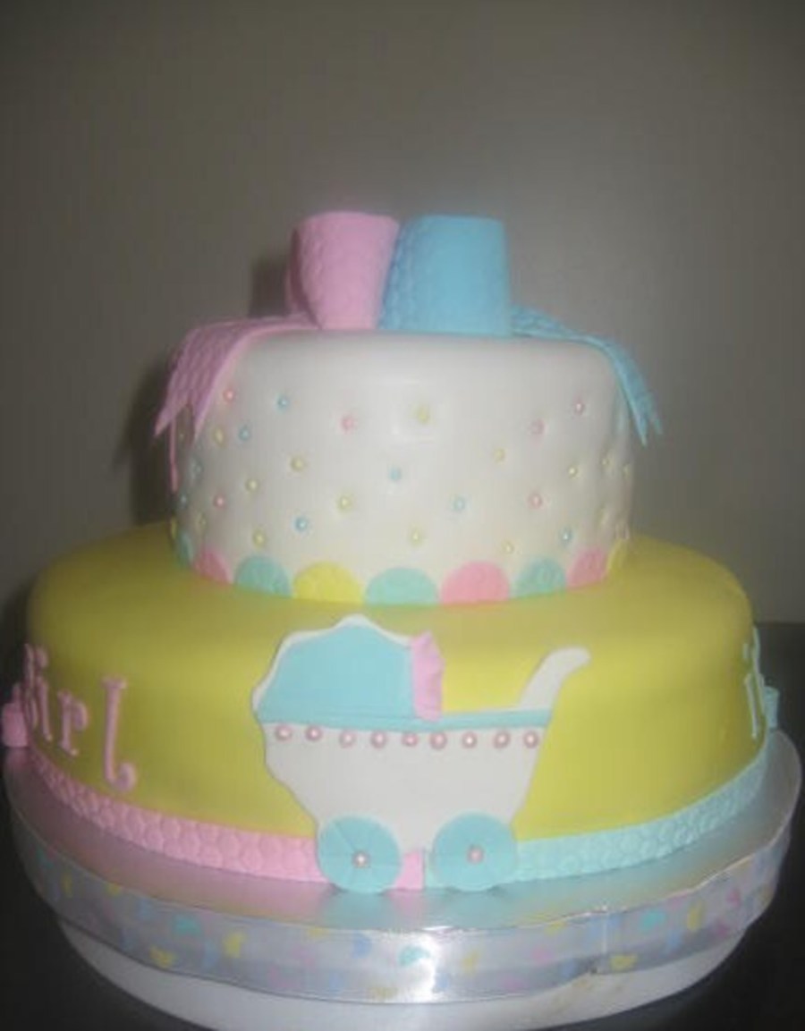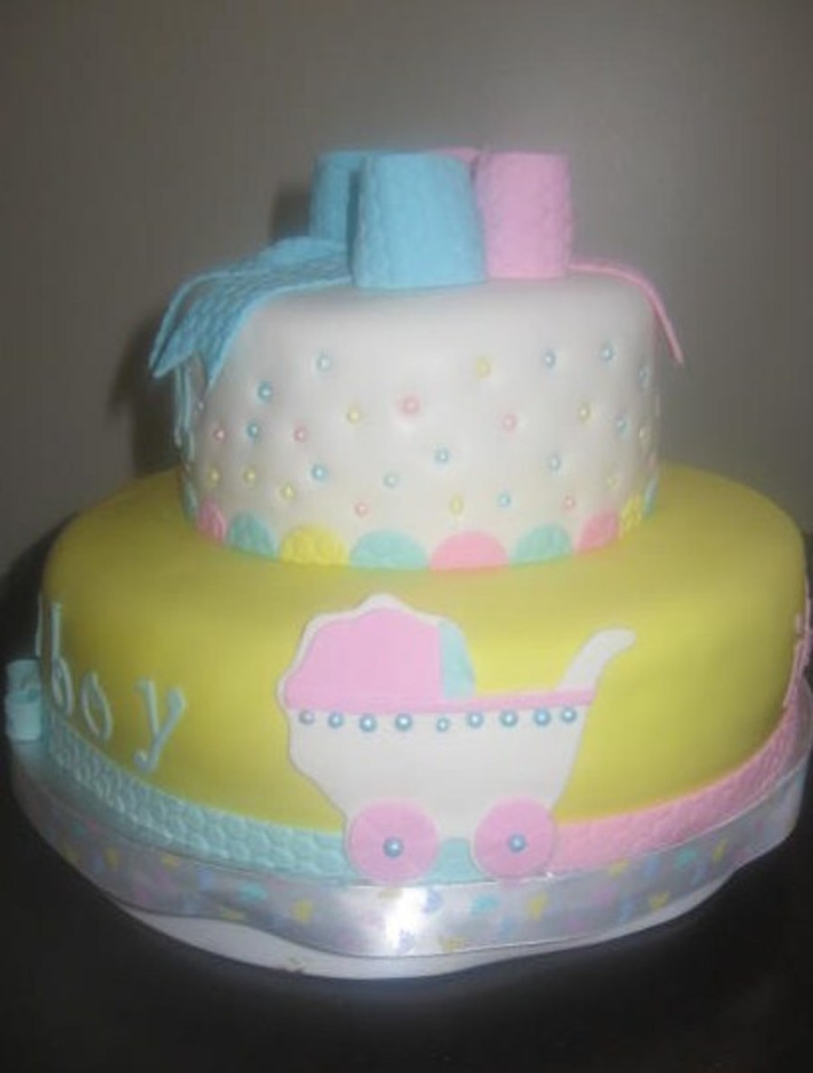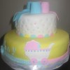 For a twin Baby Shower, it's a girl and boy. It's pink on one side and blue on the other. choc 10" round and vanilla 6" round with BC icing. Covered in fondant, letters and bow are gumpaste.