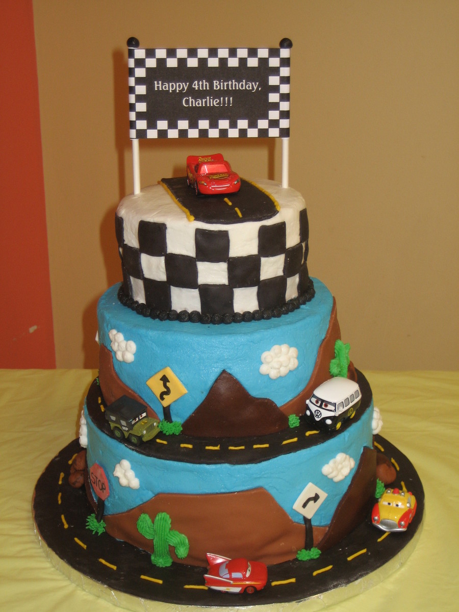 Inspired by lots of cool cakes here on CC. My first big tiered cake- special thanks to those who answered my questions along the way! Almond cake with buttercream icing, marshmallow fondant landscape, and gumpaste signs. 10", 8", and 6 " layers, had to offset the middle layer slightly to make more room for the road. I was really proud of this one! :)