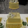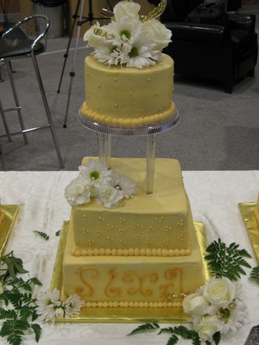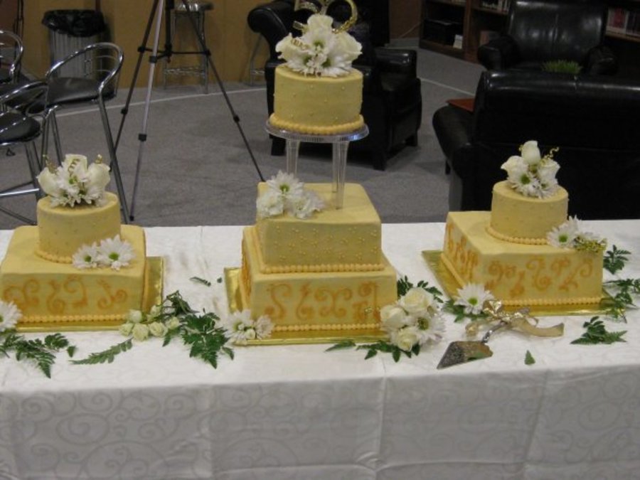 I flew to Iowa to make this cake as a surprise for my aunt's 50th anniversary party! I was so excited to get to use gold dragees!!! lol!!! Scrollwork is piped RI and then painted with gold luster dust. Made Pink Velvet, WASC and Pumpkin Spice for the cakes... all were a hit! TFL!!
