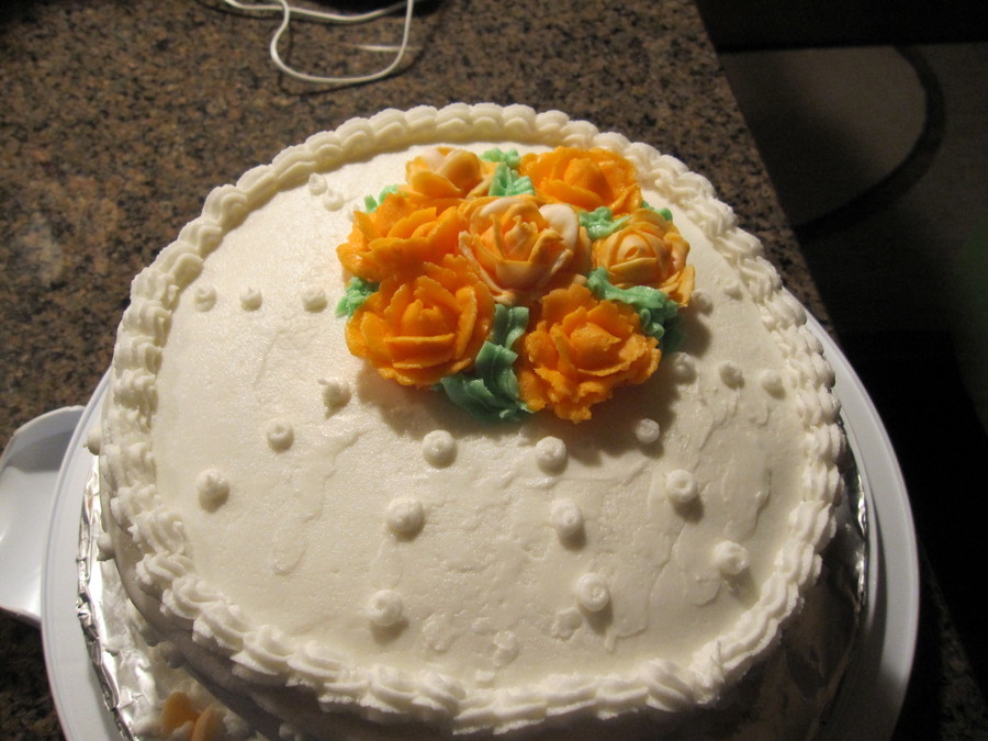 Butter cream icing and roses. WASC cake with pudding filling.