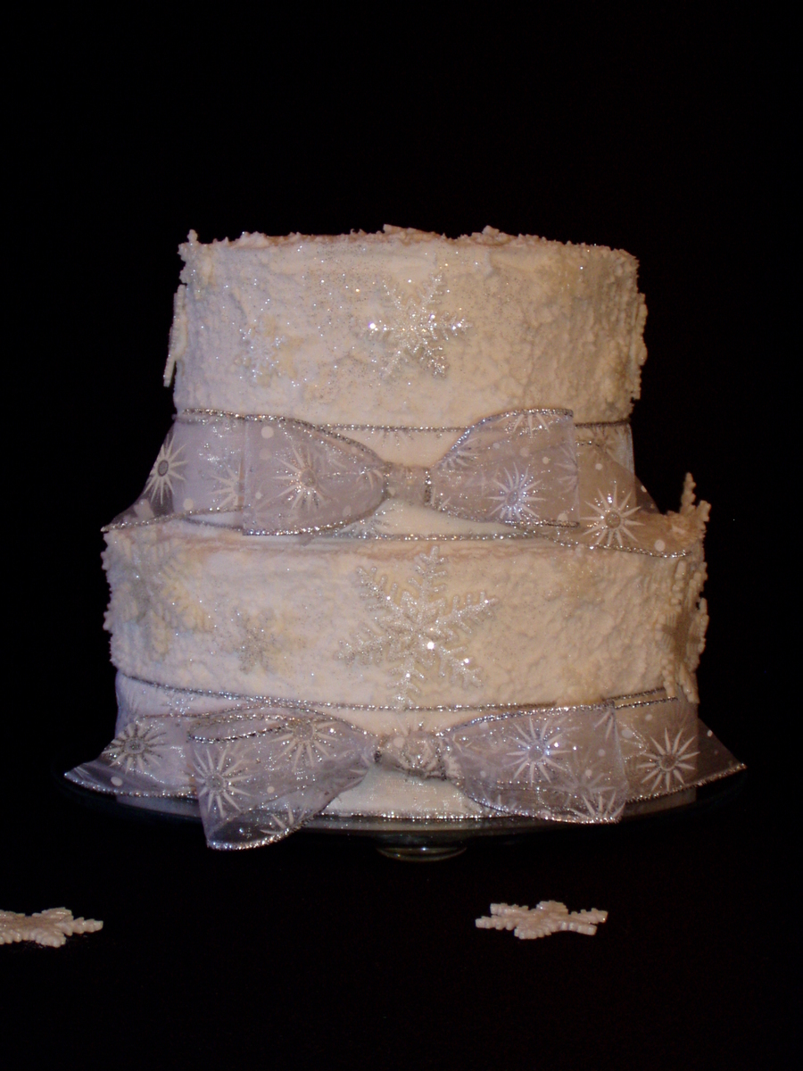 Small cake for the staff of my children's school. 6" and 8" tiers covered in BC and then "stucco'd" with thinned BC to get the texture. Snowflakes are cut from MMF.