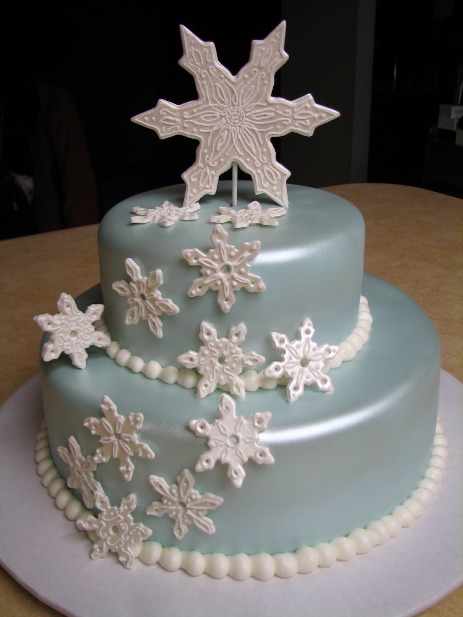 6" & 10" WASC covered with MMF & airbrushed with AmeriMist pearl sheen. Snowflakes are gumpaste; used a cookie cutter, punched out circles with icing tips, misted with pearl sheen then added RI piping. Small flakes are 1-1/2". Special thanks to my instructor, a truly fantastic teacher! TFL & happy holidays!