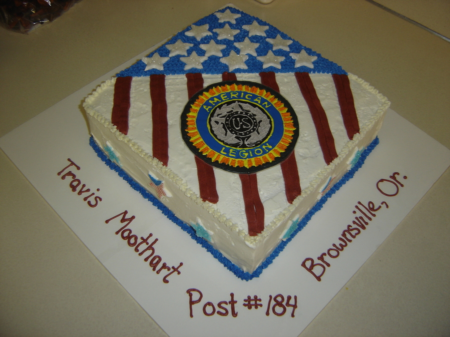 this cake was to celebrate a new american legion post . the patch was made of color flow icing and the cake is covered in buttercream with fondant stars. special thanks to Pebblez87 for providing the inspiration/design for this cake!