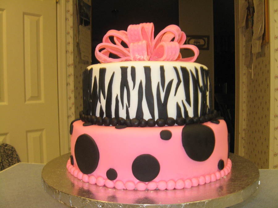 Bottom tier is yellow cake with buttercream filling covered in pink fondant with black polka dots. Top tier is chocolate with buttercream filling covered in white fondant with black zebra stripes and fondant/gumpaste bow.