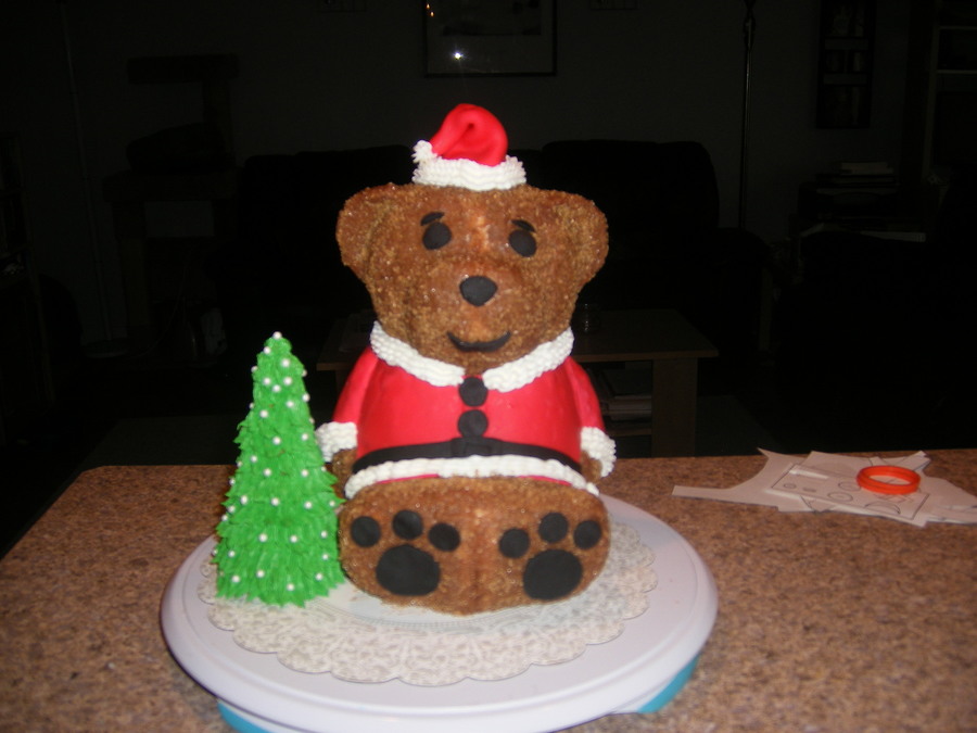 Pound cake with fondant santa costume, ice cream cone Christmas tree with buttercream and edible pearls as ornaments.