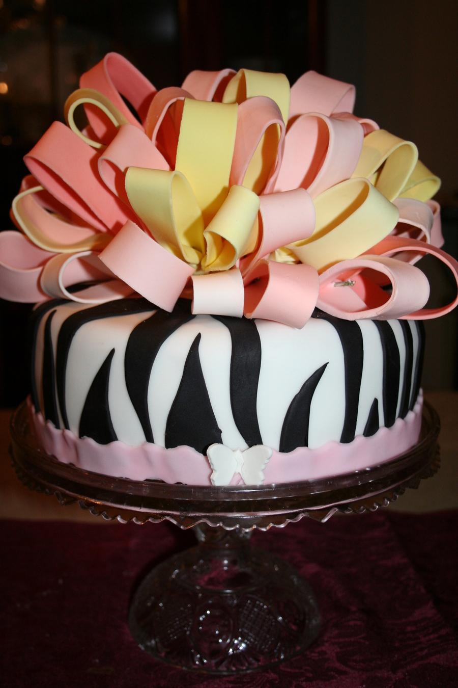 This is a birthday cake I made for my daughter's friend. She was turning 19!. LOVED it. I made the ribbon bits from 1/2 fondant and 1/2 gumpaste. The cake itself is a yellow cake with a yummy chocolate filling. Hope you like it.