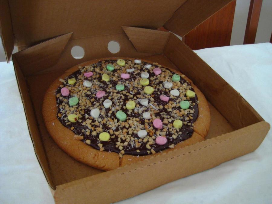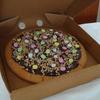 This is just a 8" chocolate cookie pizza i did for a chocolatic friend for her b'day who loves chocolate pizza's and wanted something simple. It is NFSC with melted chocolate and nutella mixture with coloured marshmallows, peanuts and coconut on top. I also made a novelty handmade gumpaste pizza cutter which is painted with silver lustre dust and gel pastes to sit on top of the box which i am really proud of and my friend thought was very cool :) Thanks for looking!