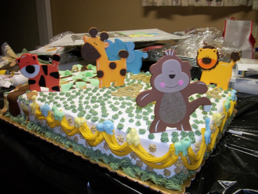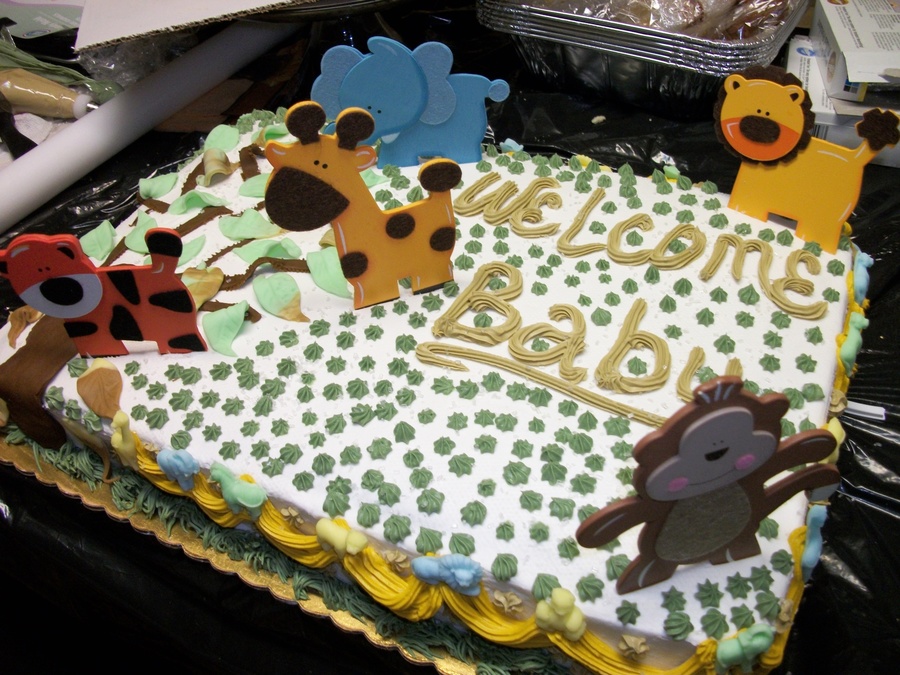 zoo animals for a baby shower. 1/2 sheet cake baby blue van cake with rum. that's what the customer asked for. plus A..B..C blocks