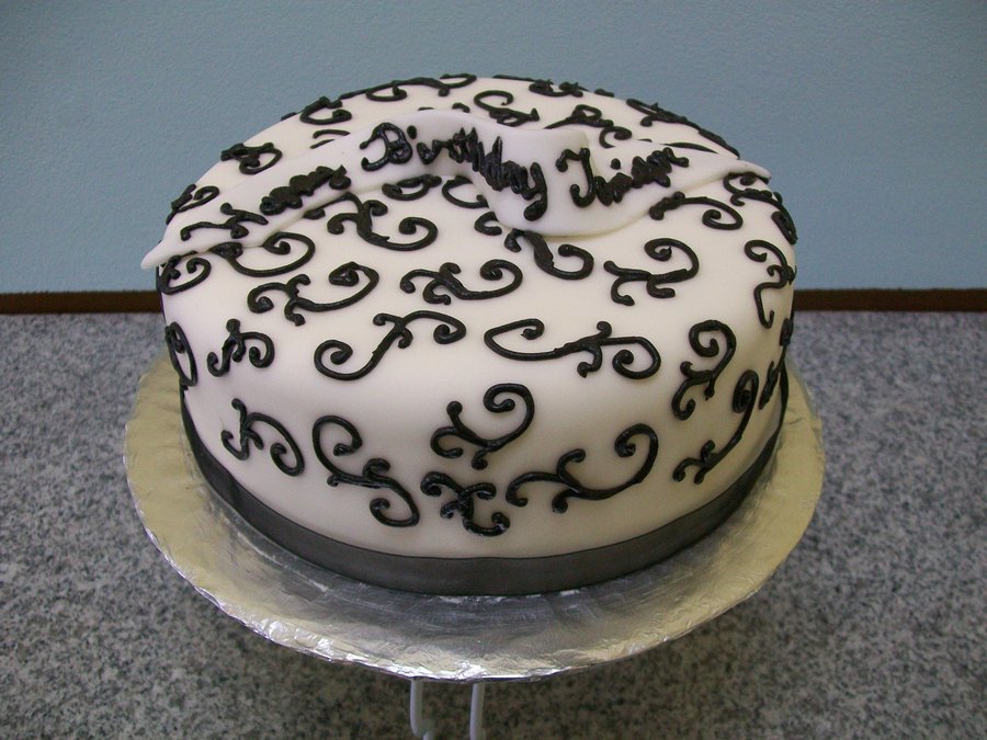 Triple Chocolate cake with chocolate ganache filling covered in MMF. Chocolate scroll work.