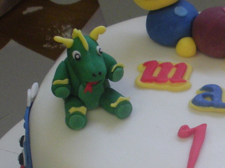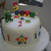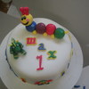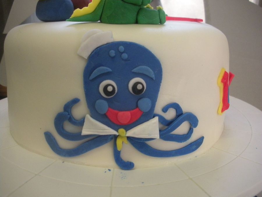 This is a a white cake with vanilla buttercream covered in mmf it was for a little boy's 1st birthday. I was kind of proud of myself for this one , it is the first fondant cake I've made with NO border and I think it came nicely. I was also really happy with the octopus! I Made all the characters that are the birthday boy's favorites. I also used food coloring to make the actually cake blue, which looked really cute when it was cut into.Thanks for looking!