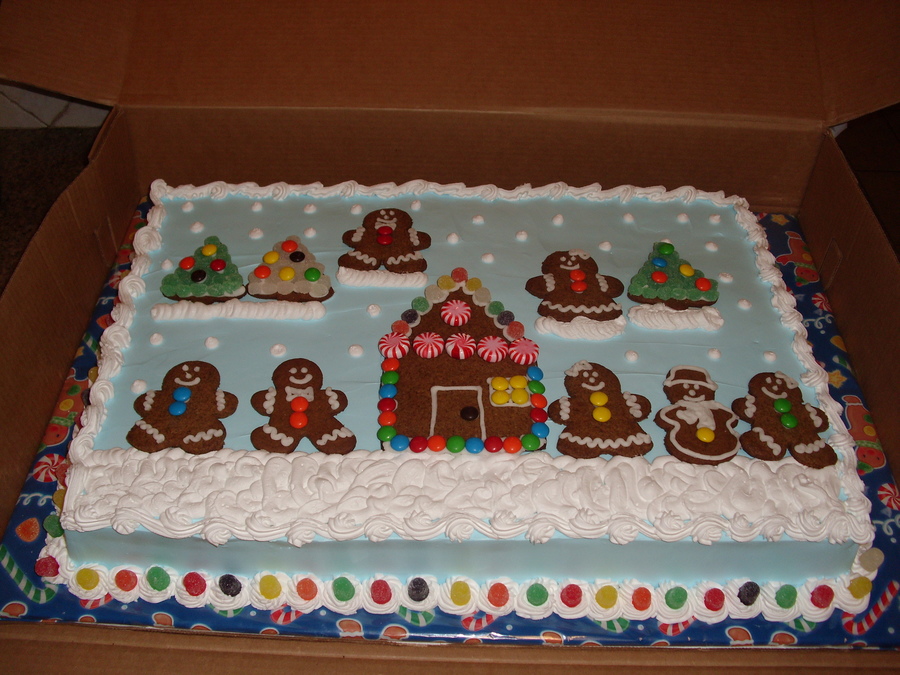 This was a last minute cake I made for my church. The cookies and house are gingerbread decorated with buttercream and candies.