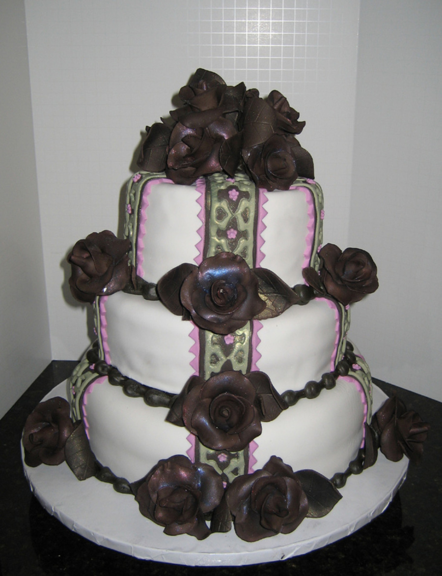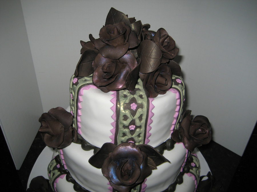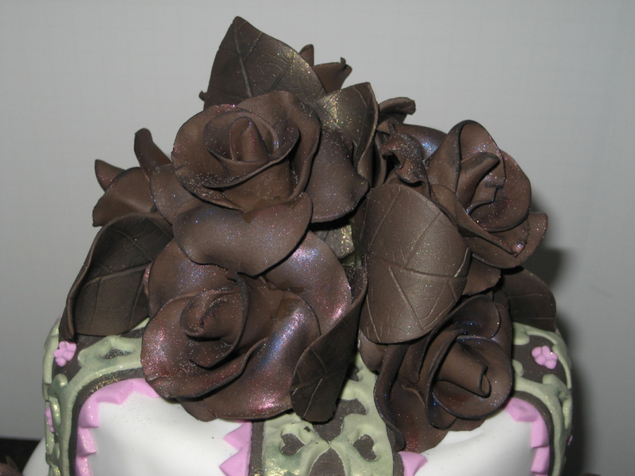 I made this for a good friend's surprise 40th birthday party. She likes greens and browns, so I made brown gum paste roses. I had some structural issues because my cake turned out too soft- but I hope the placement of the roses helped cover any flaws!!! Thanks for taking a look.