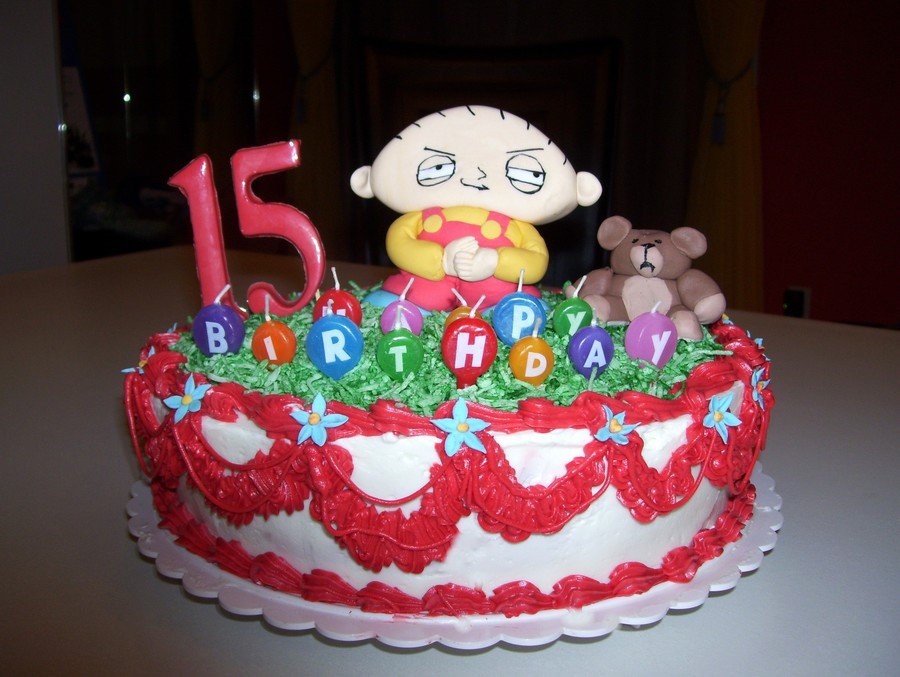 The numbers are made with chocolate and Stewie in sugar paste.