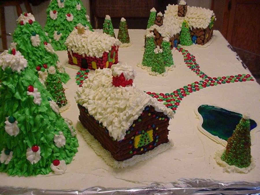 This is a scene we did for a Christmas party at our Pythian retirement Home. there is a log cabin, brick house, and rock house along with trees and pond.