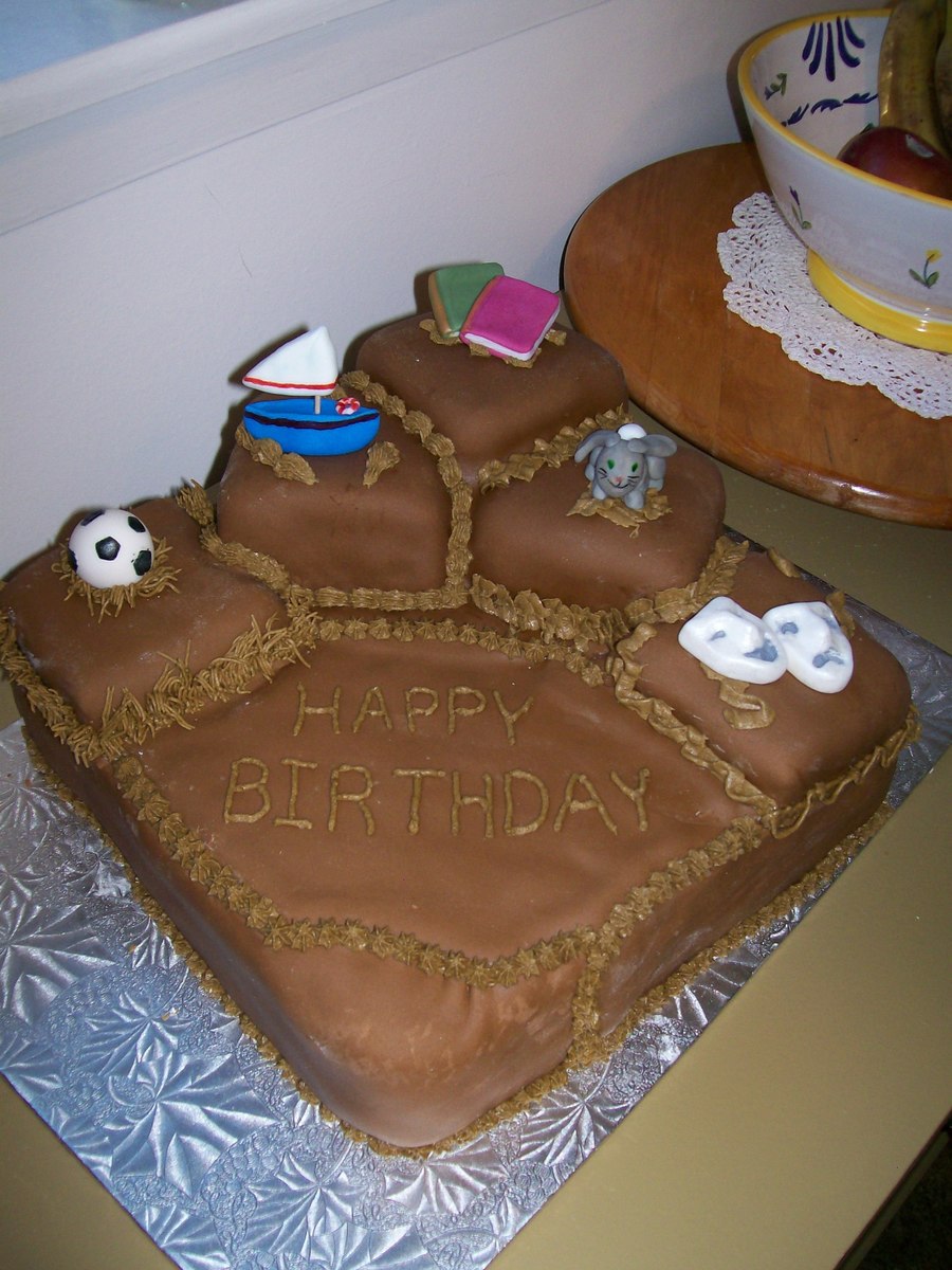 This was for four of my sisters and my brothers' birthday. It was a chocolate cake fures in fondant, as well as covered in fondant. All piping done with buttercream
