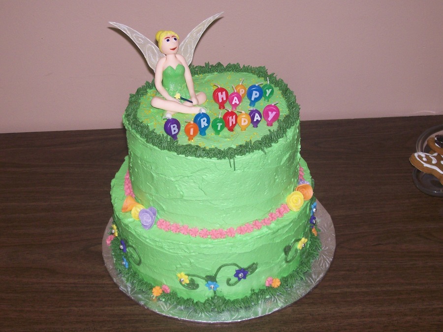 Chocolate and vanilla layered cake, with vanilla buttercream frosting, Flowers are fondant. Tinkerbell is fondant with a little CMC. Tink's wings are edible paper, piped with piping gel and dusted with gold pearl dust.