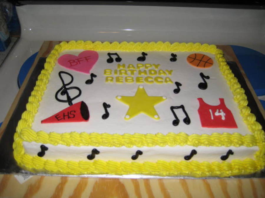 Bday cake for my bff daughter. She wanted a HSM cake. I was at a loss for what to do. So I made all the fondant cutouts of symbols from the movie and added BC music notes. She loved it.