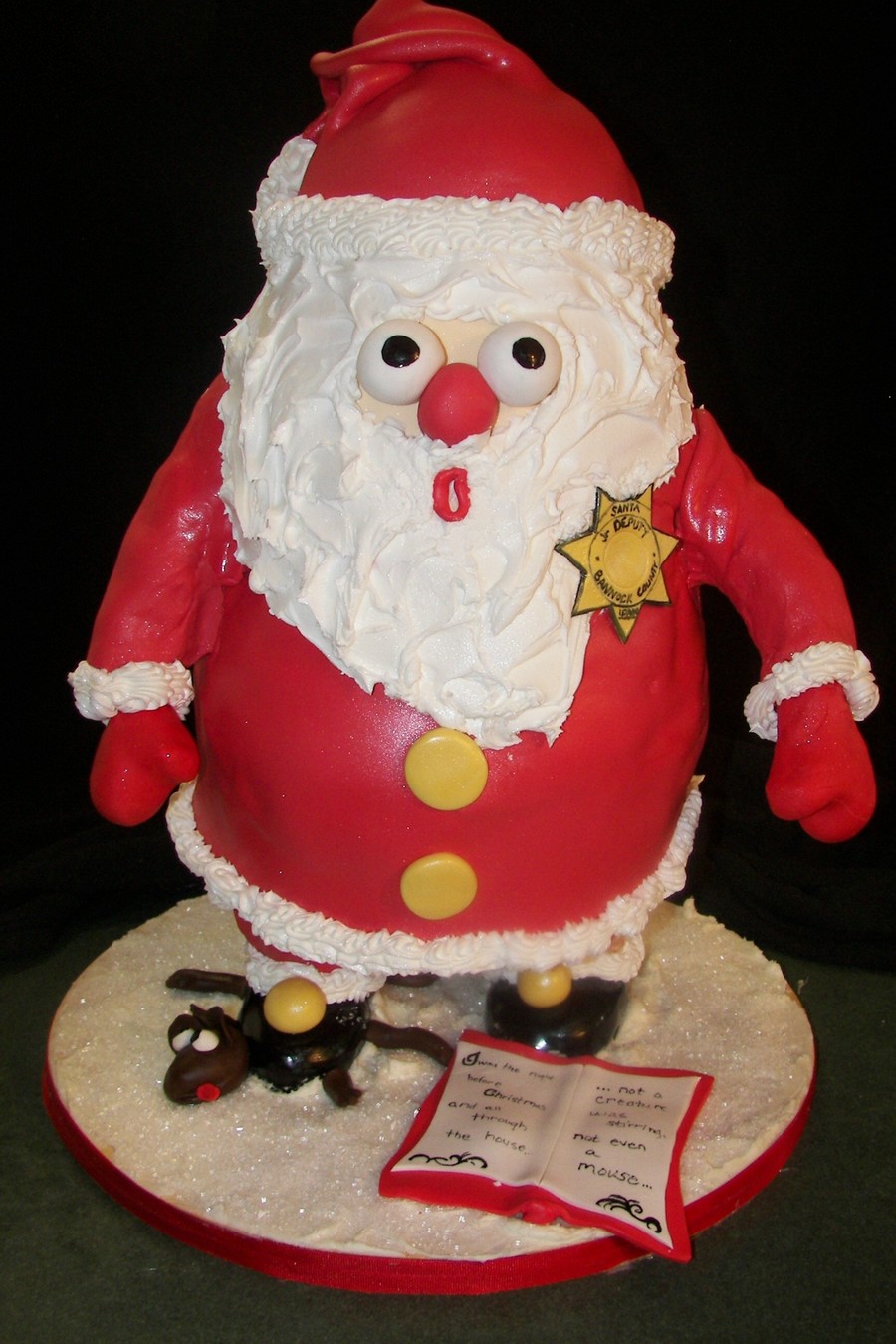 This is all cake (and it was pretty big!) Santa realizes that he has stepped on the mouse from the book, The Night Before Christmas, which is lying at his feet.