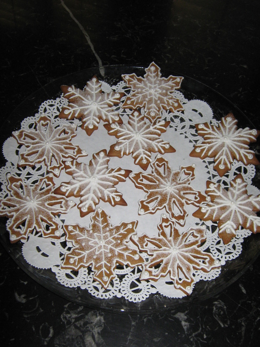 My first attempt at snowflakes. Martha Stewart gingerbread recipe. Royal icing using liquid pasteurized whites. Nonpareil pearls. Dusted with sugar and pixie dust.