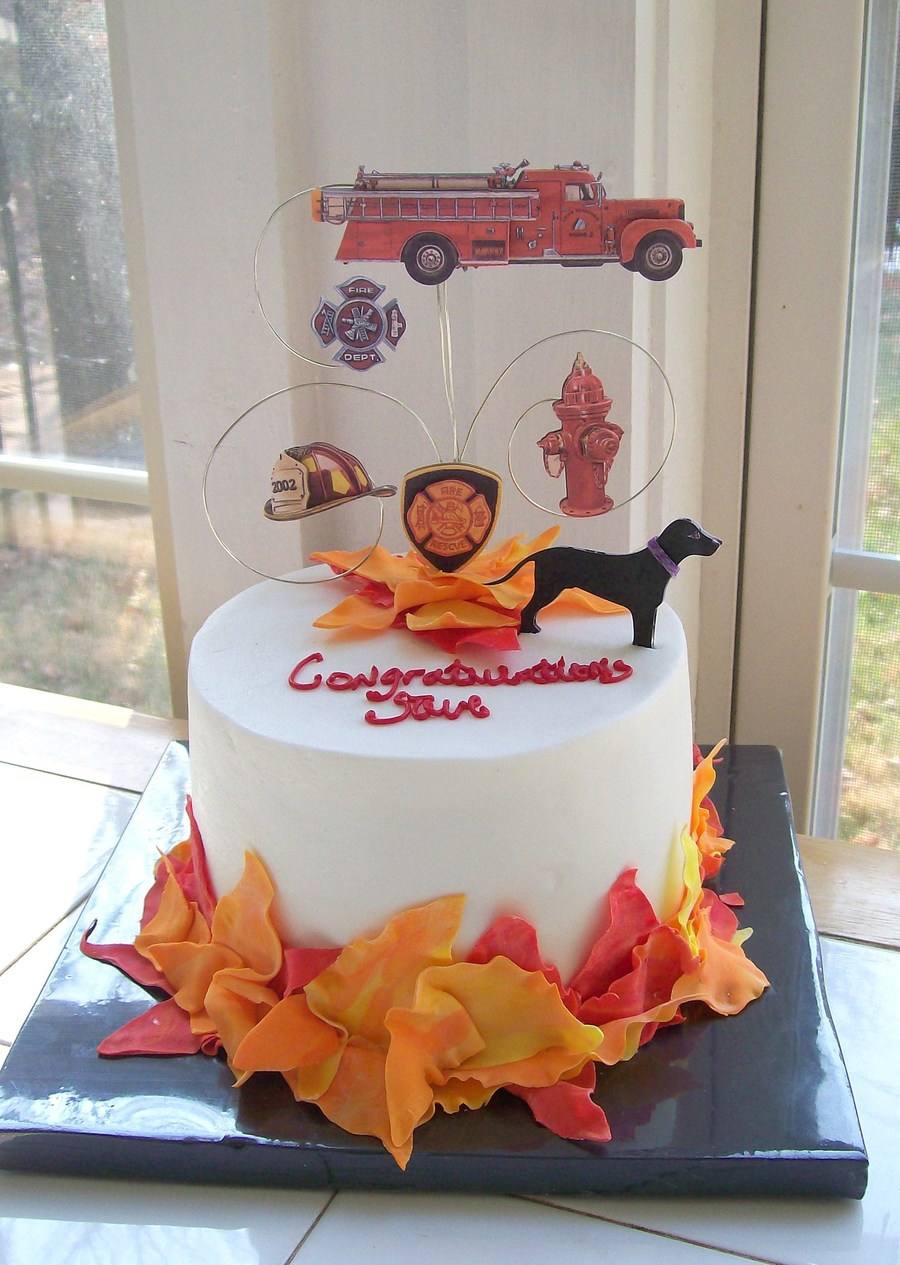 A cake for a fireman's retirement. Buttercream with Gumpaste flames. Scrapbook stickons on the wires.