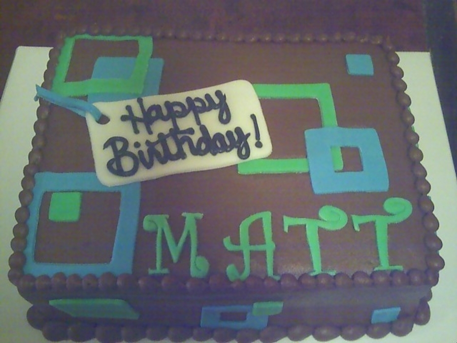 Chocolate cake with chocolate buttercream and fondant accents.