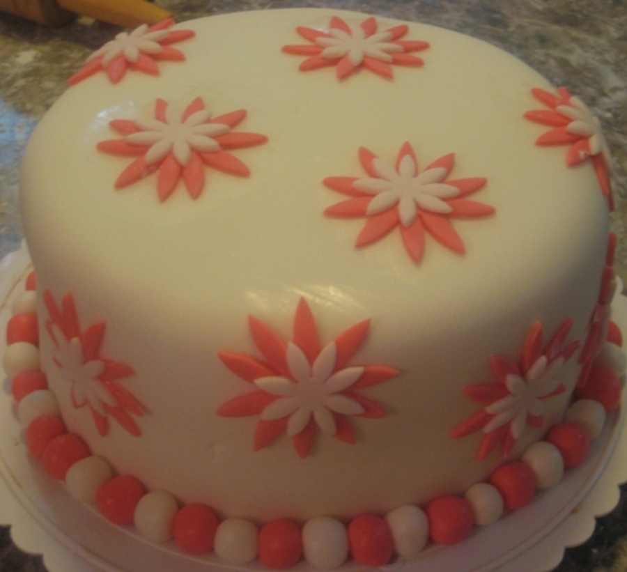 I made this cake while visiting a friend in Ohio. I had none of my equipment and had to make do with what she had (i.e. not stand mixer, icing spatulas, large rolling pin, etc.) I think I pulled it off rather nicely. Made MMF, bought some red icing coloring and daisy cutters from Michael's and performed some magic. Simple cake, but still cute.