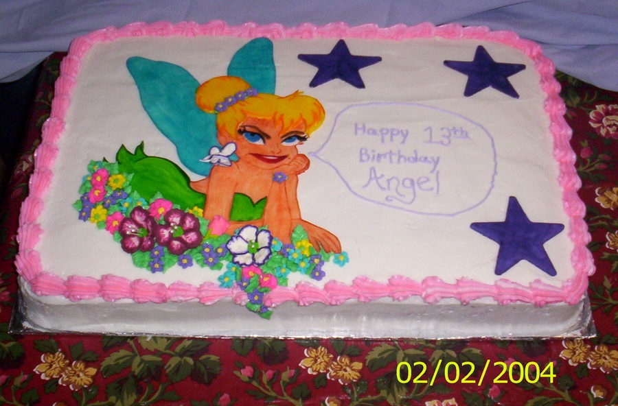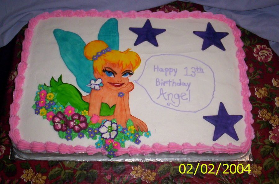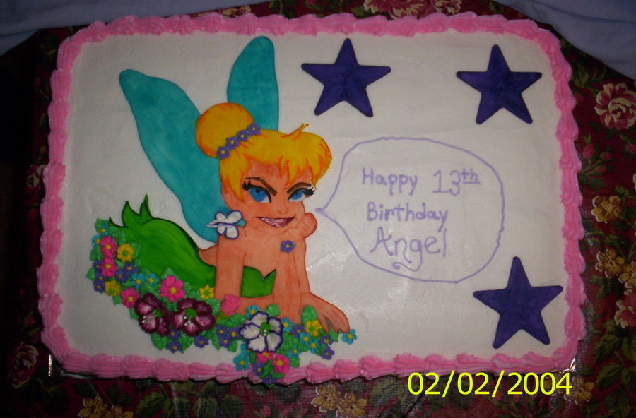 I used a picture of tinkerbell to cut out fondant shapes, put them together like a puzzle then hand painted each piece with icing coloring. It was a time consuming project but worth every minute. Thanks for looking. Also I used royal icing flowers.