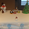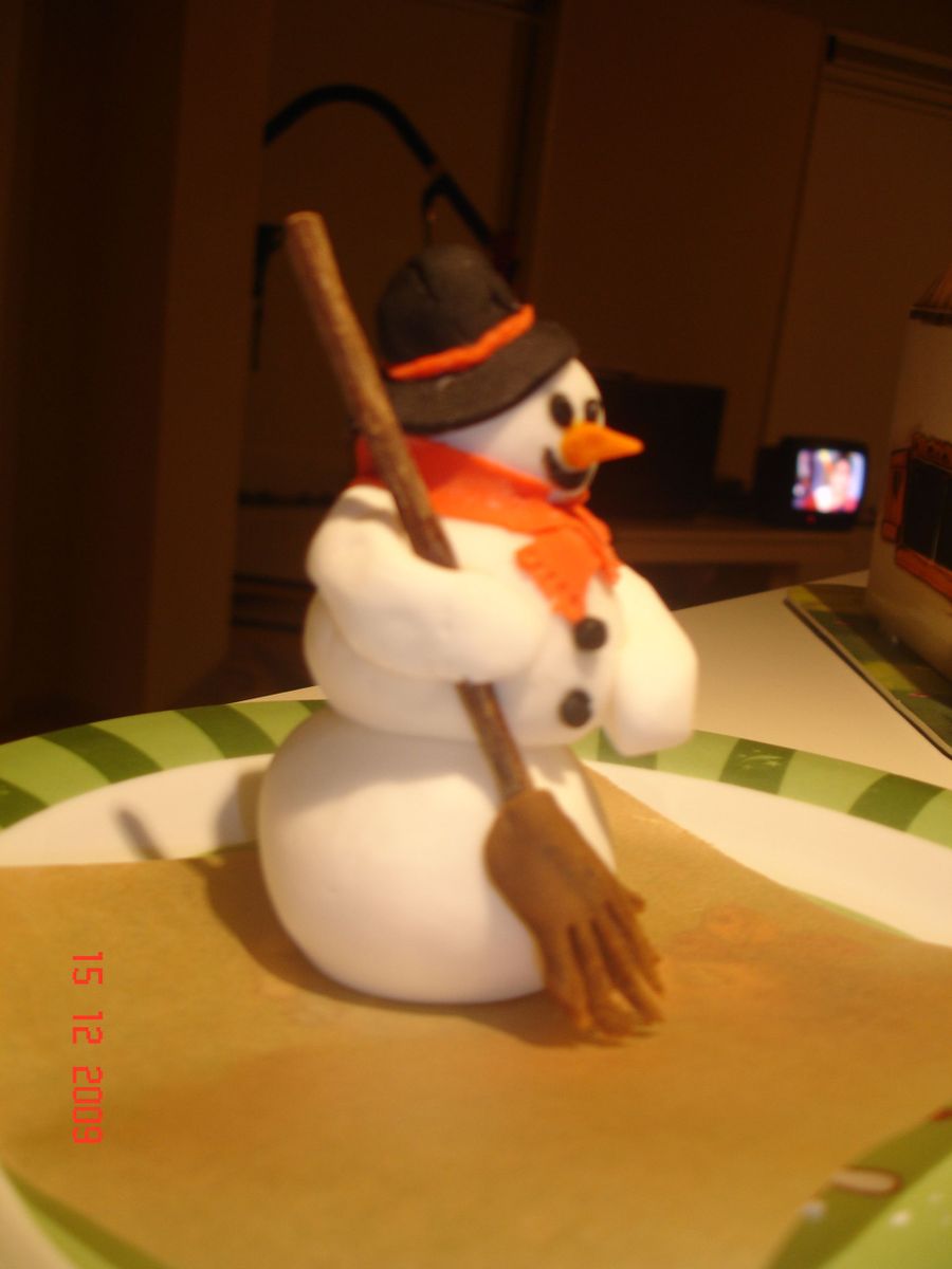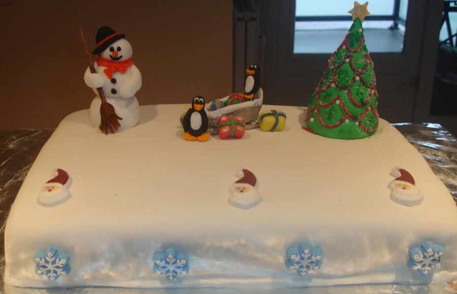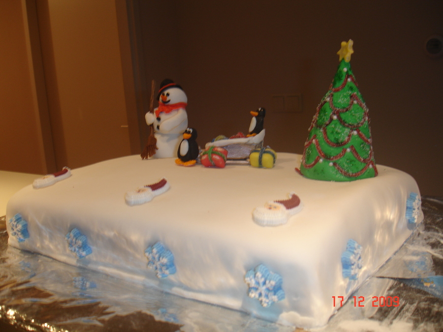 made a cristmas cake for my daughters cristmas dinner at school. cake filled with rasberry/cherry .2 layerd cake . was fun to make the snowman en cristmas tree decorated with candy en wilton pearls 2 pinguins and a slee and some presents Thanks for looking
