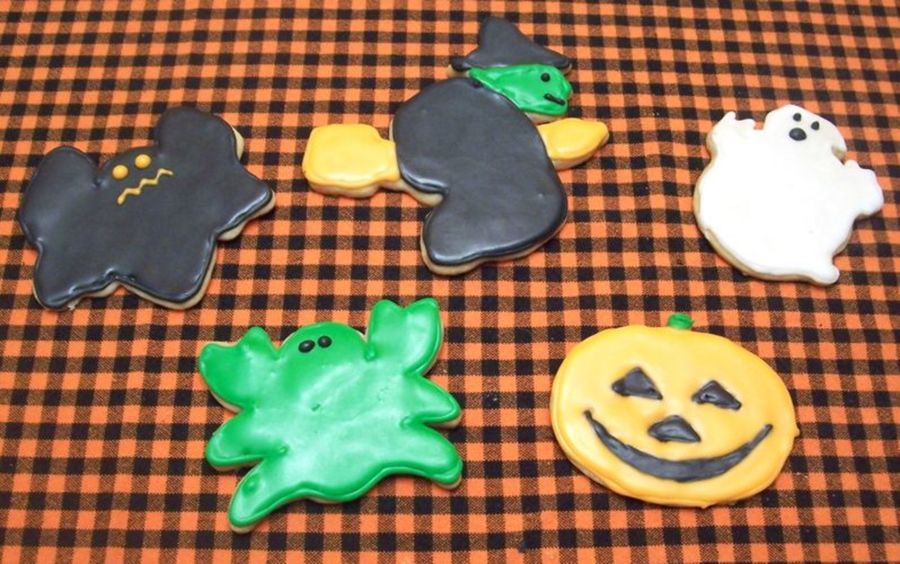 These cookies were also made for the same Halloween party. Simple sugar cookies-witch, pumpkin, ghost, spider, and bats.