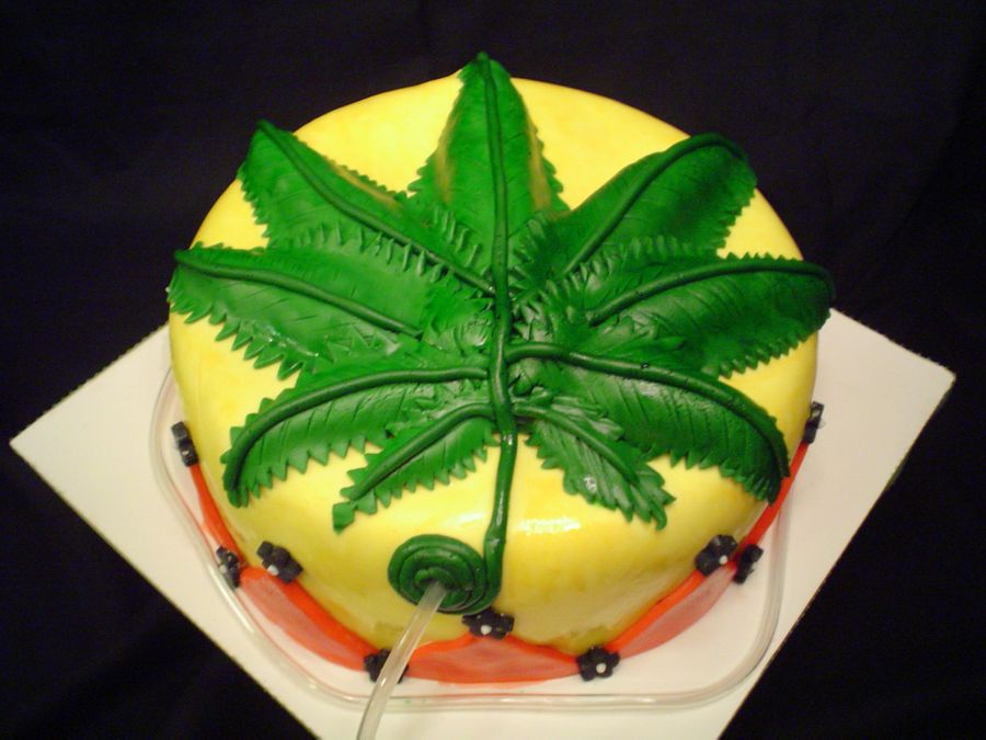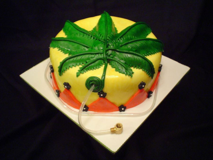 Chocolate cake with chocolate buttercream filling and peppermint flavored fondant. The leaf is made of a cake ball and molded, then covered in the fondant. The tube runs all the way thru and I was told that it worked!
